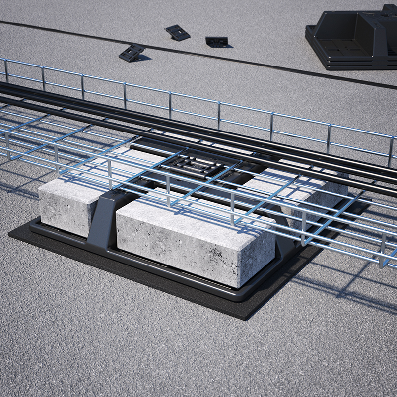 Our product range comprises closed cable tray, wide span tray and mesh cable tray systems. With the mounting adapter, you can fix mesh cable trays to the OBO FangFix stones in a single action. The covers are secured to the flat roof by tightening straps.