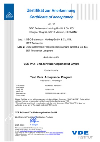 The DIN / EN / IEC 62561 standard series demands several tests such as lightning impulse currents, electrical, mechanical and environmental tests. This is how an adequate lightning current impulse and capability and a resistance against environmental stresses can be proven.
