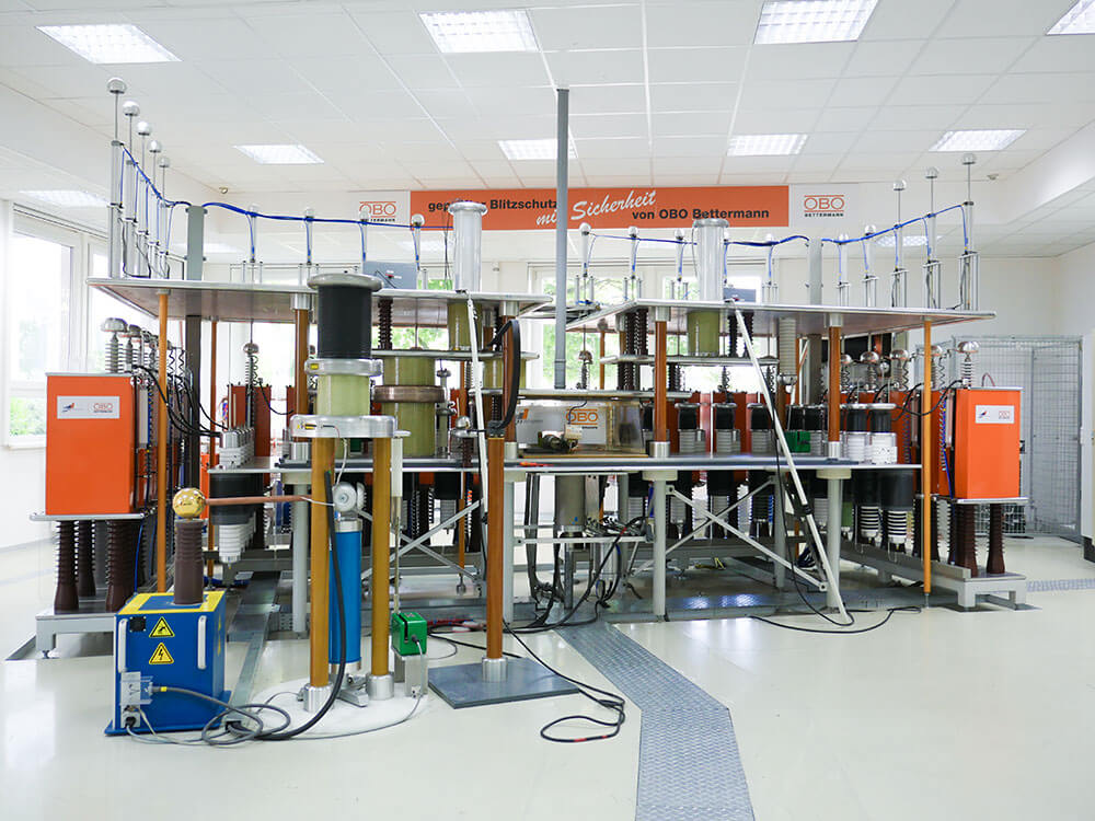 OBO products stand for the highest quality. To guarantee this, we do not only rely on external tests but also on our in-house BET Testcenter. Here, the quality, resilience and load-bearing capacity of OBO products are put to the test in extensive inspections and tests. Among other things, our highly qualified specialists test lightning protection components, lightning protection structures and surge protective devices. The effects of lightning events are also examined here from a scientific point of view.