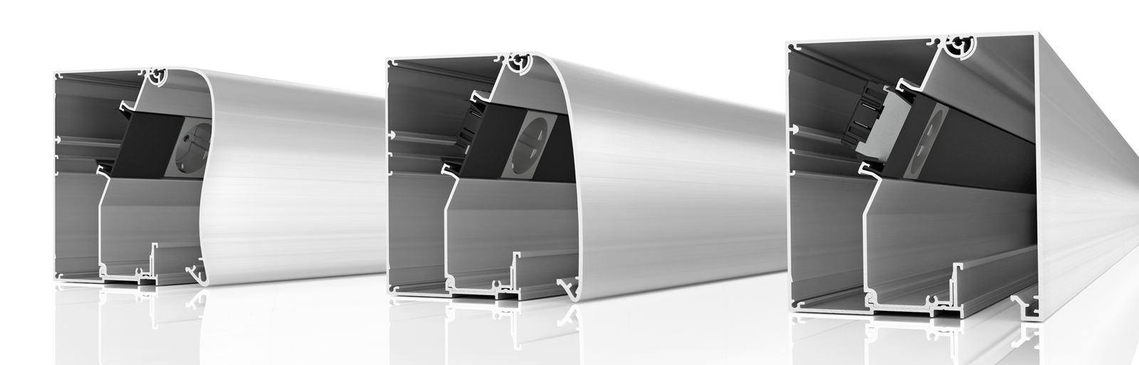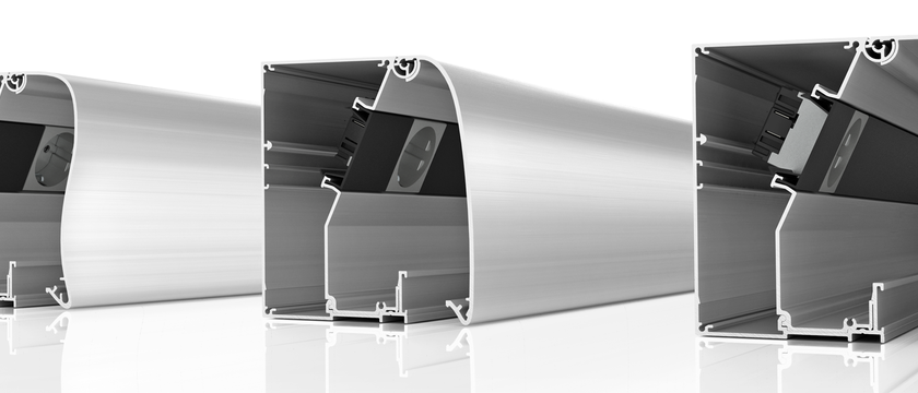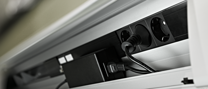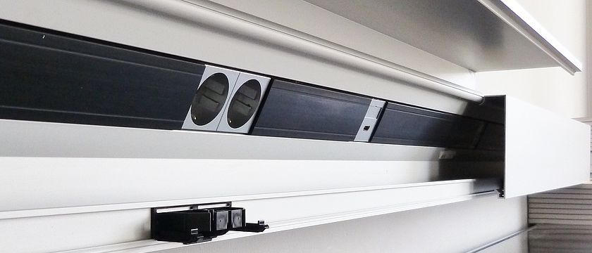 The GAD device installation trunking permits cable routing and device installation in a high-quality environment. With this trunking system, requirements for electrical services can be fulfilled "invisibly". Connectors, power units or data/network connections disappear behind a hinged cover. The cables are run out of the trunking system in bundled form using a cover adapter at the desired point. Optionally, an LED light bar can be mounted on the underside of the trunking system, which illuminates a storage area located under the system.