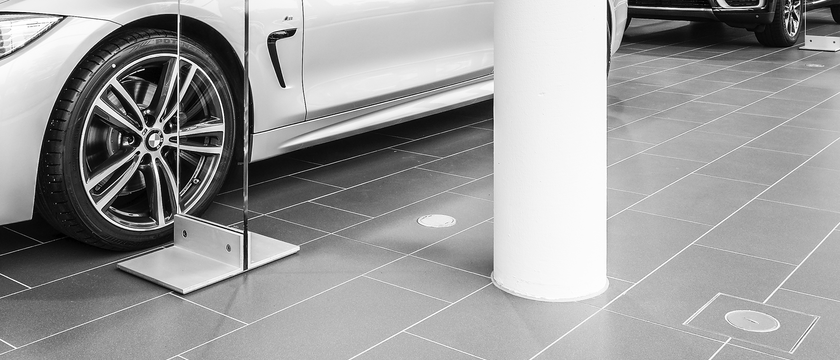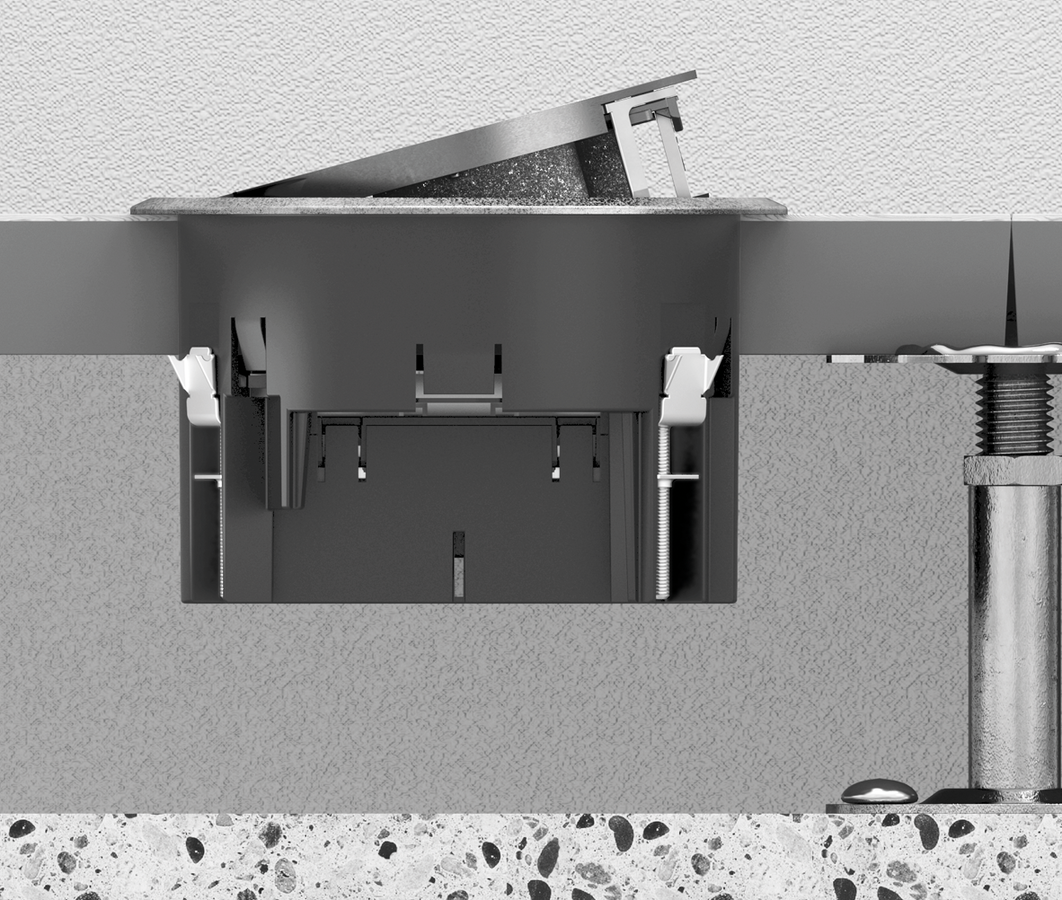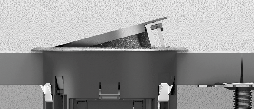 The minimum installation height from the top edge of the floor is 85 mm. Installation can take place in screed constructions or in raised and cavity floors. In screed constructions, installation takes place in a height-adjustable screed socket with a height-adjustment range of 85 to 130 mm via simple 3-point height adjustment. A further height increase with accessories is also possible.