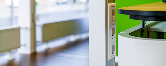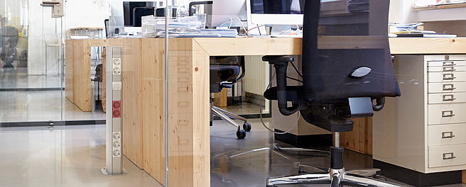 A decisive aspect in selection is the option of supplying the pole. Especially in large offices, floor-ceiling service poles make use of their flexibility when they can be supplied with power from above through a false ceiling. A further criterion is the number of electrical services required, because this value determines the installation space required in the pole.