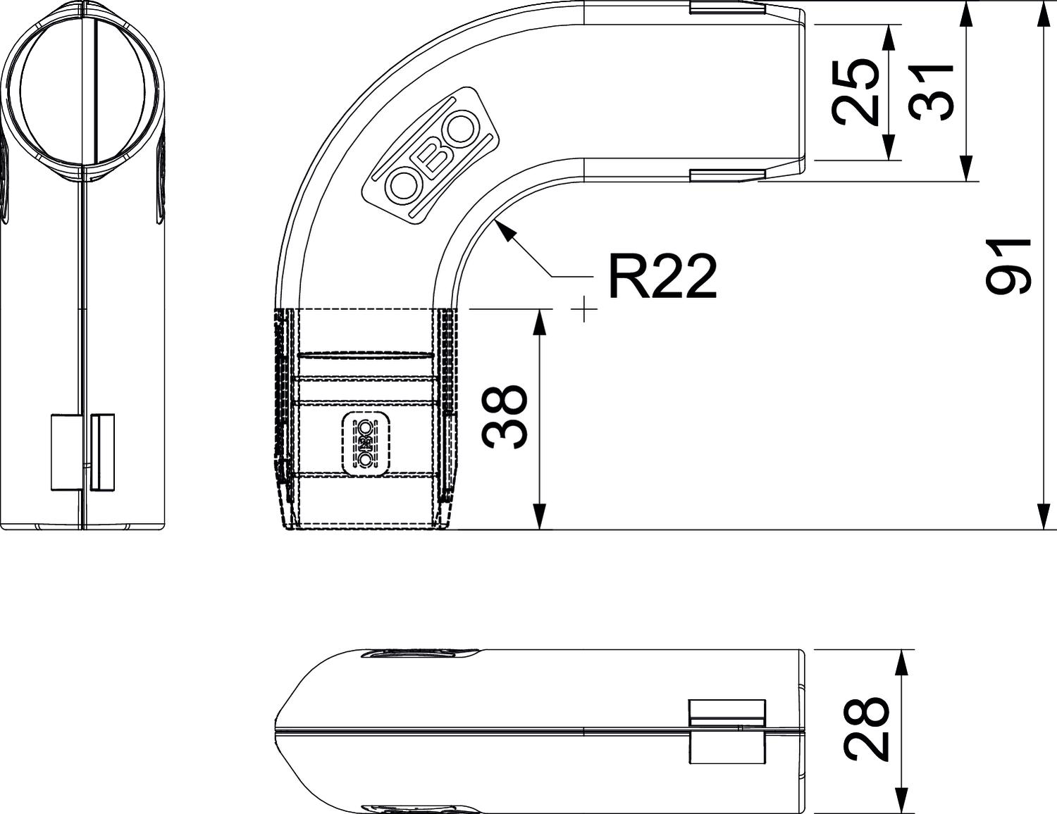 Angle of the bend 90 ° Brushed surface no CO2 Footprint (GWP) Cradle-to-Gate 0,0949 kg CO2e / 1 Piece Colour Light grey; RAL 7035 Dimension M25 Dimension B 31,2 mm Dimension d 25 mm Dimension L 91 mm Dimension L1 38 mm Dimension R 22 mm Flexible no Halogen-free yes Material Polypropylene Permitted temperature range, max. 60 °C Polished surface no Two-part yes Version for Connector With inspection opening and lid no With sleeve no - All types