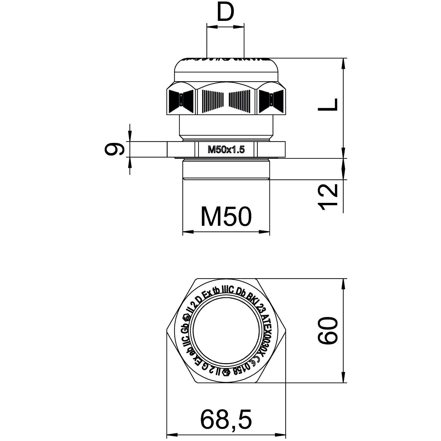 Bend protection no CO2 Footprint (GWP) Cradle-to-Gate 0,4032 kg CO2e / 1 Piece Colour Black Dimension M50 Dimension E 68,5 mm Dimension G M50 mm Dimension L max. 57 mm Dimension L min. 42 mm Dimension L1 13 mm Dimension L2 9 mm explosion-proof yes Fibre-glass reinforced no Flat cable gland no For Ex zone yes For Ex zone dust 21, 22 For Ex zone gas 1, 2 Halogen-free yes Hexagonal corner dimension 68,5 mm Impact-resistant no Material Polyamide Nominal thread size 50 Permitted temperature range, max. 65 °C Permitted temperature range, min. -20 °C Protection rating IP68 Sealing area D, max. 38 mm Sealing area D, min. 32 mm Sealing insert, multiple no Splittable gland no Strain relief option no Thread M50 x 1,5 Thread increase 1,5 mm Thread length 13 mm Thread type Metric Type of seal Sealing ring Unstable torque 17 Nm Version for Straight WAF 60 With locknut no - All types