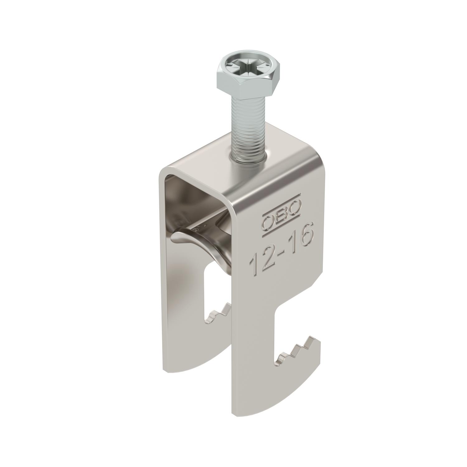 Product descriptionClamp clip with F-foot, metal pressure sleeve with rounded edges to protect the cable. For vertical and horizontal mounting of 1 single cable on flat bars. With 1-start screw thread on pressure sleeve, universal hexagonal screw head WAF10, with slot and cross recess. Suitable for assembly indoors and outdoors. We recommend the use of a counter-sleeve.