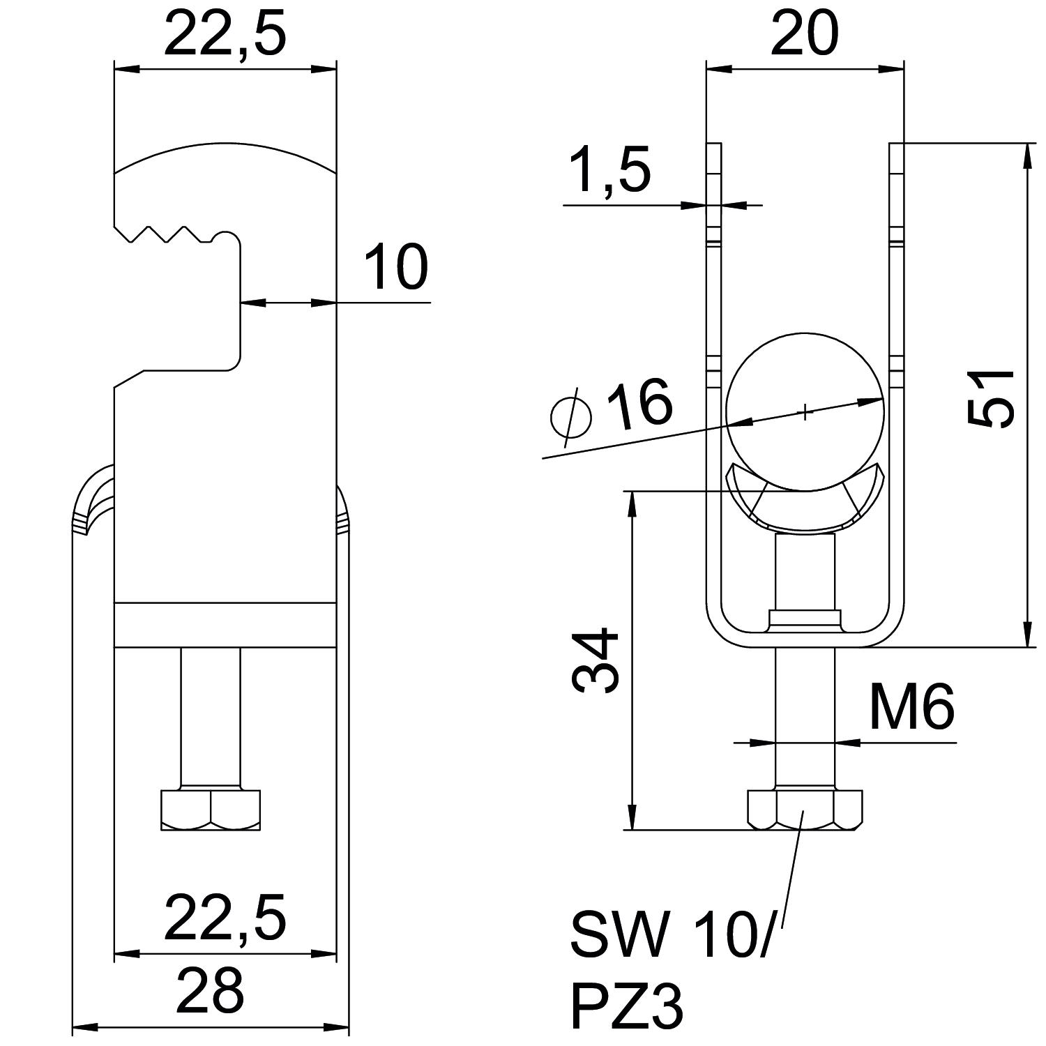Clamping range D, max. 16 mm Clamping range D, min. 12 mm CO2 Footprint (GWP) Cradle-to-Gate 0,2841 kg CO2e / 1 Piece Dimension 12-16mm Dimension A 22,5 mm Dimension B 20 mm Dimension C 28 mm Dimension G (mm) M6 Dimension H 51 mm Dimension L 34 mm Dimension t 1,5 mm For pipe diameter, max. 16 mm For pipe diameter, min. 12 mm Halogen-free yes Height 51 mm Length 22,5 mm Length of external dimensions 28 mm Material Stainless steel 1.4301 Material addition Rustproof steel Material of trough Rustproof steel Material quality of trough Stainless steel 304 (1.4301) Max. Tightening torque 3 Nm Mounting type Flat profile Number of cables/pipes 1 Plate thickness 1,5 mm Slot width 10 mm Surface Bright, treated Surface addition Untreated Thread M6 Width 20 mm With counter-trough no With metal trough yes - All types
