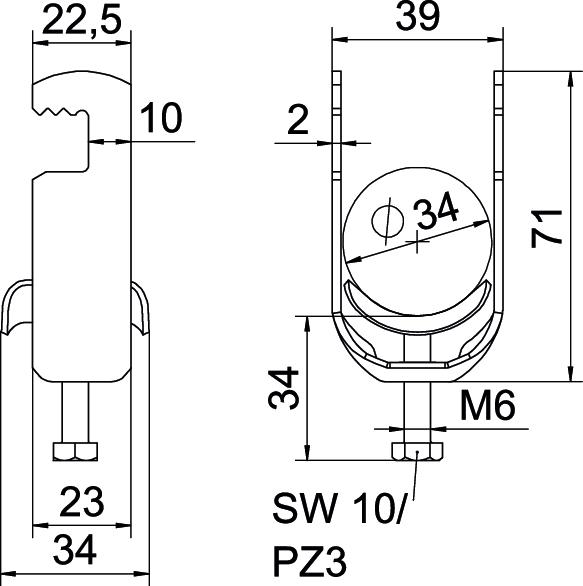 Clamping range D, max. 34 mm Clamping range D, min. 28 mm CO2 Footprint (GWP) Cradle-to-Gate 0,1759 kg CO2e / 1 Piece Dimension 28-34mm Dimension A 22,5 mm Dimension B 39 mm Dimension C 34 mm Dimension G (mm) M6 Dimension H 71 mm Dimension L 34 mm Dimension t 2 mm For pipe diameter, max. 34 mm For pipe diameter, min. 28 mm Halogen-free yes Height 71 mm Length 22,5 mm Length of external dimensions 34 mm Material Steel Material addition Steel Material of trough Steel Max. Tightening torque 3 Nm Mounting type Flat profile Number of cables/pipes 1 Plate thickness 2 mm Slot width 10 mm Surface Hot-dip galvanised Surface addition hot galvanised Thread M6 Width 39 mm With counter-trough no With metal trough yes - All types