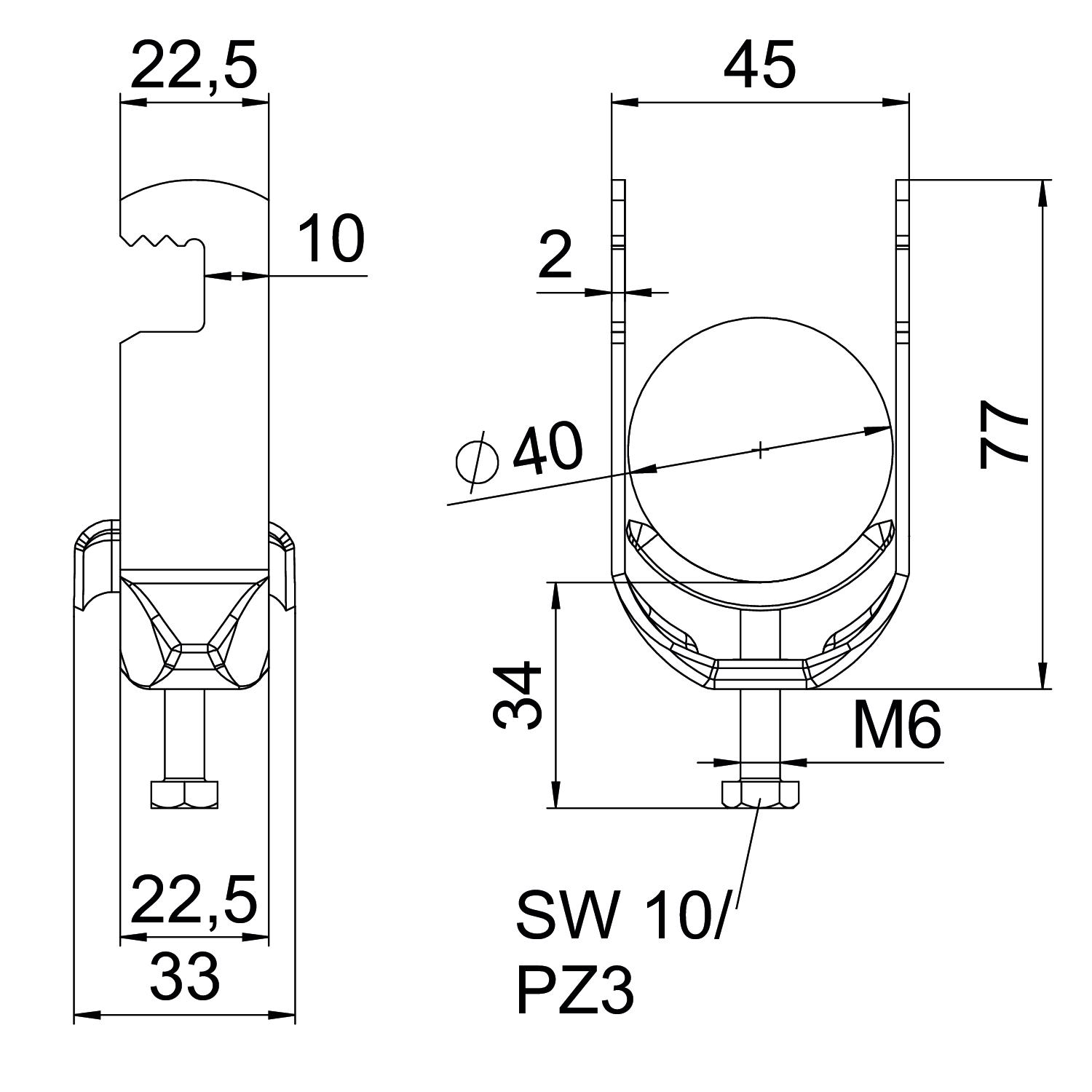 Clamping range D, max. 40 mm Clamping range D, min. 34 mm CO2 Footprint (GWP) Cradle-to-Gate 0,1852 kg CO2e / 1 Piece Dimension 34-40mm Dimension A 22,5 mm Dimension B 45 mm Dimension C 33 mm Dimension G (mm) M6 Dimension H 77 mm Dimension L 34 mm Dimension t 2 mm For pipe diameter, max. 40 mm For pipe diameter, min. 34 mm Halogen-free yes Height 77 mm Length 22,5 mm Length of external dimensions 33 mm Material Steel Material addition Steel Material of trough Steel Max. Tightening torque 3 Nm Mounting type Flat profile Number of cables/pipes 1 Plate thickness 2 mm Slot width 10 mm Surface Hot-dip galvanised Surface addition hot galvanised Thread M6 Width 45 mm With counter-trough no With metal trough yes - All types