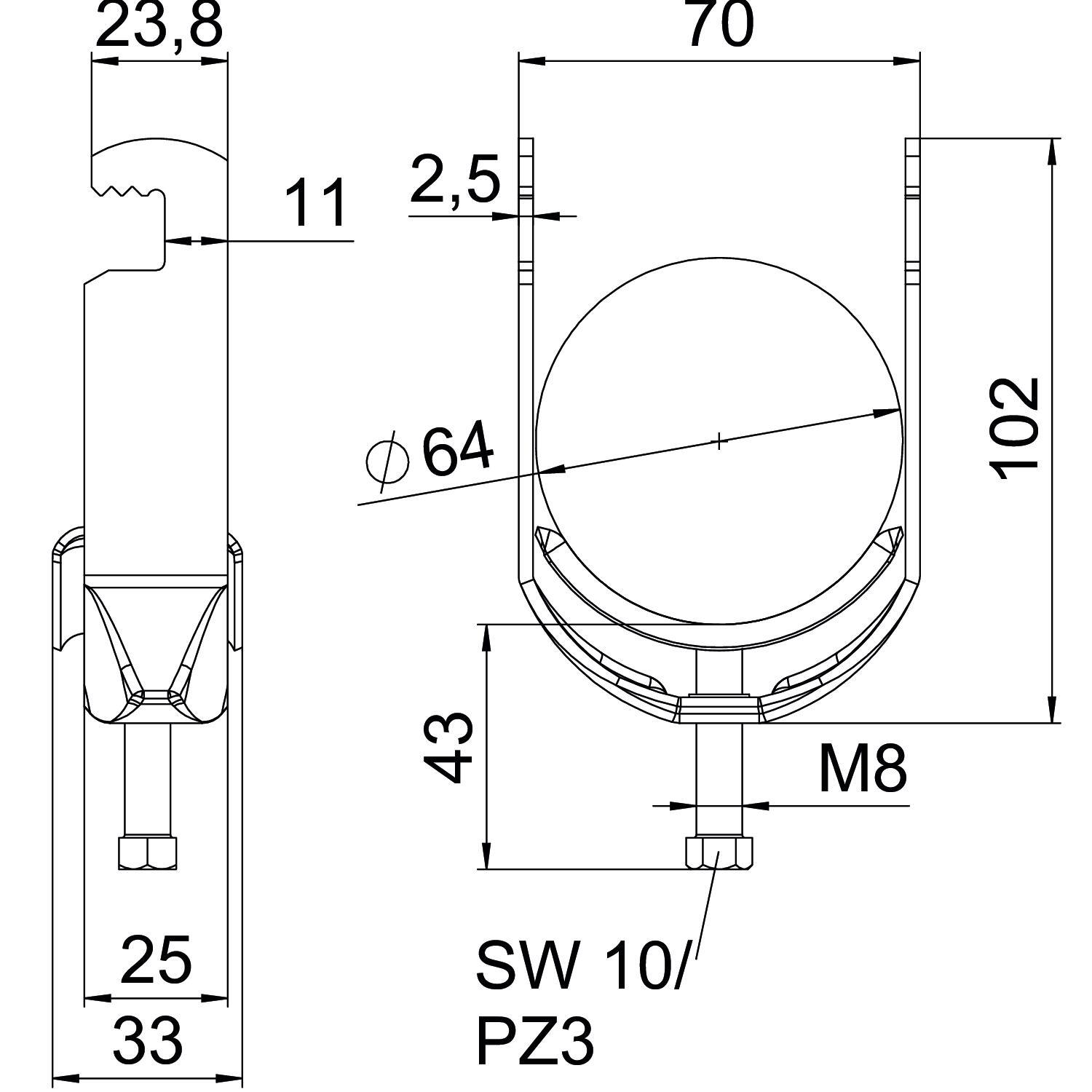 Clamping range D, max. 64 mm Clamping range D, min. 58 mm CO2 Footprint (GWP) Cradle-to-Gate 0,3554 kg CO2e / 1 Piece Dimension 58-64mm Dimension A 25 mm Dimension B 70 mm Dimension C 33 mm Dimension G (mm) M8 Dimension H 102 mm Dimension L 43 mm Dimension t 2,5 mm For pipe diameter, max. 64 mm For pipe diameter, min. 58 mm Halogen-free yes Height 102 mm Length 25 mm Length of external dimensions 33 mm Material Steel Material addition Steel Material of trough Steel Max. Tightening torque 5 Nm Mounting type Flat profile Number of cables/pipes 1 Plate thickness 2,5 mm Slot width 10 mm Surface Hot-dip galvanised Surface addition hot galvanised Thread M8 Width 70 mm With counter-trough no With metal trough yes - All types