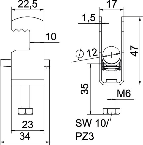 Clamping range D, max. 12 mm Clamping range D, min. 8 mm CO2 Footprint (GWP) Cradle-to-Gate 0,083 kg CO2e / 1 Piece Dimension 08-12mm Dimension A 22,5 mm Dimension B 17 mm Dimension C 34 mm Dimension G (mm) M6 Dimension H 47 mm Dimension L 35 mm Dimension t 1,5 mm For pipe diameter, max. 12 mm For pipe diameter, min. 8 mm Halogen-free yes Height 47 mm Length 22,5 mm Length of external dimensions 34 mm Material Steel Material addition Steel Material of trough Plastic Material quality of trough Polypropylene Max. Tightening torque 3 Nm Mounting type Flat profile Number of cables/pipes 1 Plate thickness 1,5 mm Slot width 10 mm Surface Hot-dip galvanised Surface addition hot galvanised Thread M6 Width 17 mm With counter-trough no With plastic trough yes - All types