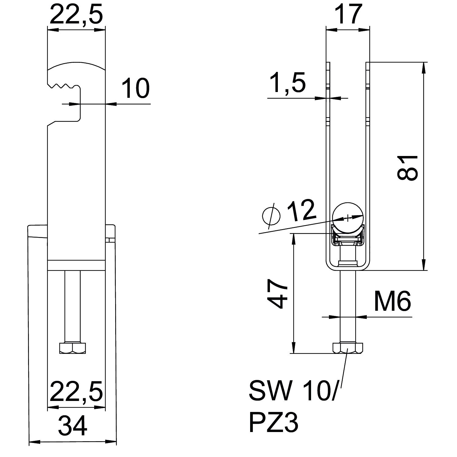 Clamping range D, max. 12 mm Clamping range D, min. 8 mm CO2 Footprint (GWP) Cradle-to-Gate 0,1666 kg CO2e / 1 Piece Dimension 8-12mm Dimension A 22,5 mm Dimension B 17 mm Dimension C 34 mm Dimension G (mm) M6 Dimension H 81 mm Dimension L 47 mm Dimension t 1,5 mm For pipe diameter, max. 12 mm For pipe diameter, min. 8 mm Halogen-free yes Height 81 mm Length 22,5 mm Length of external dimensions 34 mm Material Steel Material addition Steel Max. Tightening torque 3 Nm Mounting type Flat profile Number of cables/pipes 3 Plate thickness 1,5 mm Slot width 10 mm Surface Hot-dip galvanised Surface addition hot galvanised Thread M6 Width 17 mm With plastic trough yes - All types