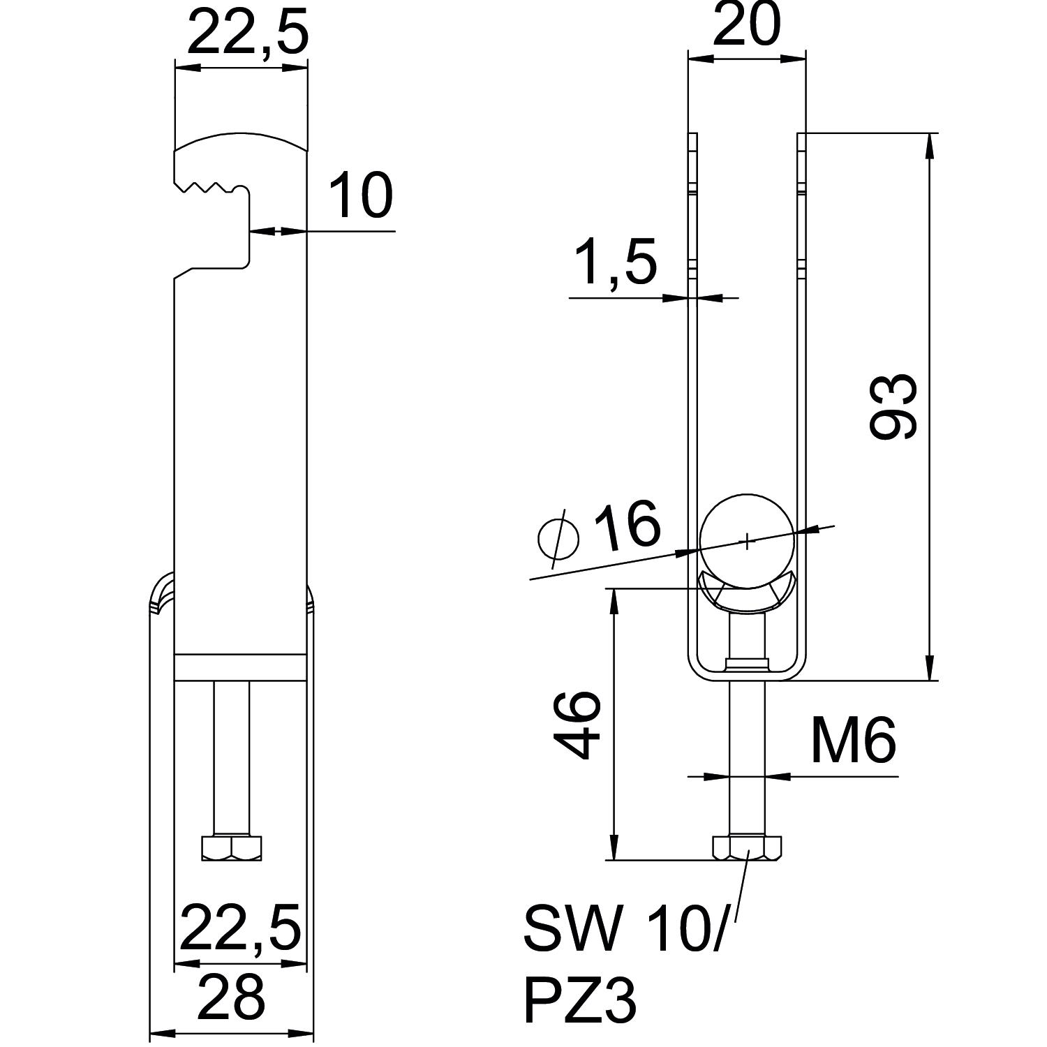 Clamping range D, max. 16 mm Clamping range D, min. 12 mm CO2 Footprint (GWP) Cradle-to-Gate 0,1905 kg CO2e / 1 Piece Dimension 12-16mm Dimension A 22,5 mm Dimension B 20 mm Dimension C 28 mm Dimension G (mm) M6 Dimension H 93 mm Dimension L 46 mm Dimension t 1,5 mm For pipe diameter, max. 16 mm For pipe diameter, min. 12 mm Halogen-free yes Height 93 mm Length 22,5 mm Length of external dimensions 28 mm Material Steel Material addition Steel Max. Tightening torque 3 Nm Mounting type Flat profile Number of cables/pipes 3 Plate thickness 1,5 mm Slot width 10 mm Surface Hot-dip galvanised Surface addition hot galvanised Thread M6 Width 20 mm With metal trough yes - All types
