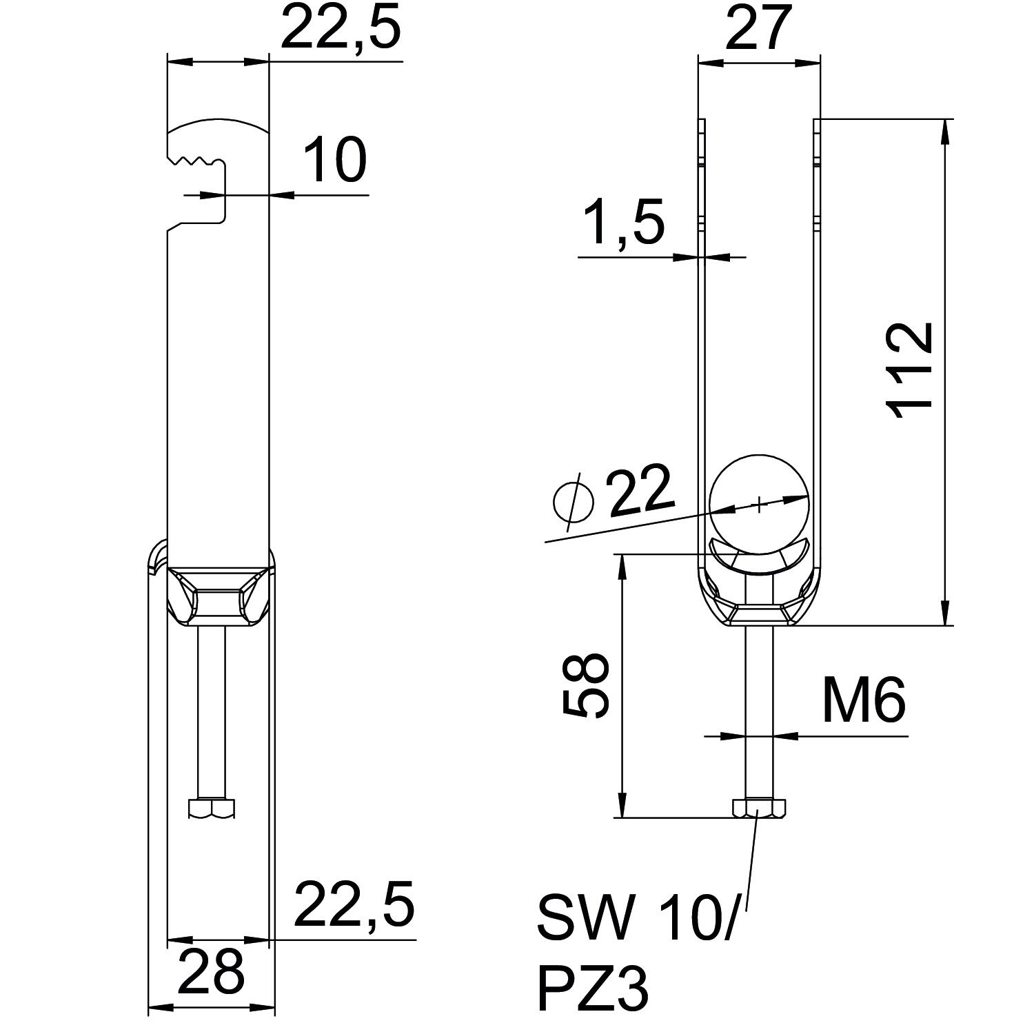 Clamping range D, max. 22 mm Clamping range D, min. 16 mm CO2 Footprint (GWP) Cradle-to-Gate 0,2219 kg CO2e / 1 Piece Dimension 16-22mm Dimension A 22,5 mm Dimension B 27 mm Dimension C 28 mm Dimension G (mm) M6 Dimension H 112 mm Dimension L 58 mm Dimension t 1,5 mm For pipe diameter, max. 22 mm For pipe diameter, min. 16 mm Halogen-free yes Height 112 mm Length 22,5 mm Length of external dimensions 28 mm Material Steel Material addition Steel Max. Tightening torque 3 Nm Mounting type Flat profile Number of cables/pipes 3 Plate thickness 1,5 mm Slot width 10 mm Surface Hot-dip galvanised Surface addition hot galvanised Thread M6 Width 27 mm With metal trough yes - All types