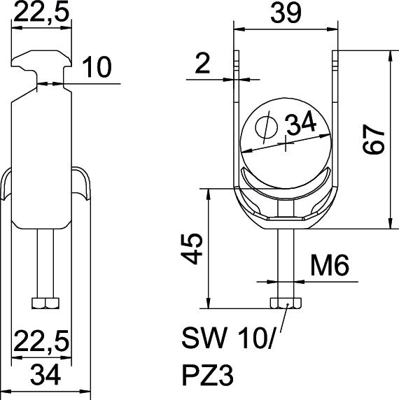 Clamping range D, max. 34 mm Clamping range D, min. 28 mm CO2 Footprint (GWP) Cradle-to-Gate 0,3798 kg CO2e / 1 Piece Dimension 28-34mm Dimension A 22,5 mm Dimension B 39 mm Dimension C 34 mm Dimension G (mm) M6 Dimension H 67 mm Dimension L 46 mm Dimension t 2 mm For pipe diameter, max. 34 mm For pipe diameter, min. 28 mm for rail with slot width (with interval), max. 17 mm for rail with slot width (with interval), min. 16 mm Halogen-free yes Height 67 mm Length 22,5 mm Length of external dimensions 34 mm Maintain electrical functions yes Material Stainless steel 1.4301 Material addition Rustproof steel Material of trough Rustproof steel Material quality of trough Stainless steel 304 (1.4301) Max. Tightening torque 3 Nm Mounting type Profile rail Number of cables/pipes 1 Plate thickness 2 mm Slot width 10 mm Surface Bright, treated Surface addition Untreated Thread M6 Width 39 mm With counter-trough no With metal trough yes With plastic trough no - All types