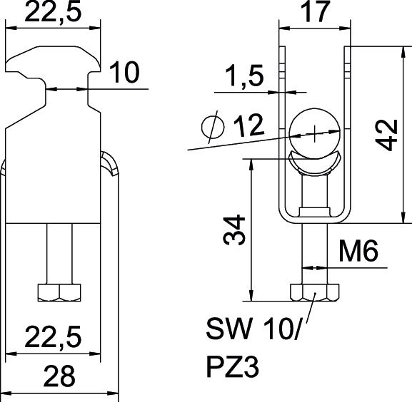 Clamping range D, max. 12 mm Clamping range D, min. 8 mm CO2 Footprint (GWP) Cradle-to-Gate 0,1994 kg CO2e / 1 Piece Dimension 08-12mm Dimension A 22,5 mm Dimension B 17 mm Dimension C 28 mm Dimension G (mm) M6 Dimension H 42 mm Dimension L 34 mm Dimension t 1,5 mm For pipe diameter, max. 12 mm For pipe diameter, min. 8 mm for rail with slot width (with interval), max. 17 mm for rail with slot width (with interval), min. 16 mm Halogen-free yes Height 42 mm Length 22,5 mm Length of external dimensions 28 mm Maintain electrical functions yes Material Stainless steel 1.4301 Material addition Rustproof steel Material of trough Rustproof steel Material quality of trough Stainless steel 304 (1.4301) Max. Tightening torque 3 Nm Mounting type Profile rail Number of cables/pipes 1 Plate thickness 1,5 mm Slot width 10 mm Surface Bright, treated Surface addition Untreated Thread M6 Width 17 mm With counter-trough no With metal trough yes With plastic trough no - All types