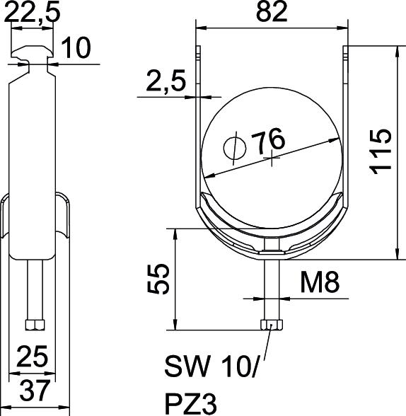 Clamping range D, max. 76 mm Clamping range D, min. 70 mm CO2 Footprint (GWP) Cradle-to-Gate 0,4403 kg CO2e / 1 Piece Dimension 70-76mm Dimension A 25 mm Dimension B 82 mm Dimension C 37 mm Dimension G (mm) M8 Dimension H 115 mm Dimension L 55 mm Dimension t 2,5 mm For pipe diameter, max. 76 mm For pipe diameter, min. 70 mm for rail with slot width (with interval), max. 17 mm for rail with slot width (with interval), min. 16 mm Halogen-free yes Height 115 mm Length 25 mm Length of external dimensions 37 mm Maintain electrical functions yes Material Steel Material addition Steel Material of trough Steel Max. Tightening torque 5 Nm Mounting type Profile rail Number of cables/pipes 1 Plate thickness 2,5 mm Slot width 10 mm Surface Hot-dip galvanised Surface addition hot galvanised Thread M8 Width 82 mm With counter-trough no With metal trough yes With plastic trough no - All types