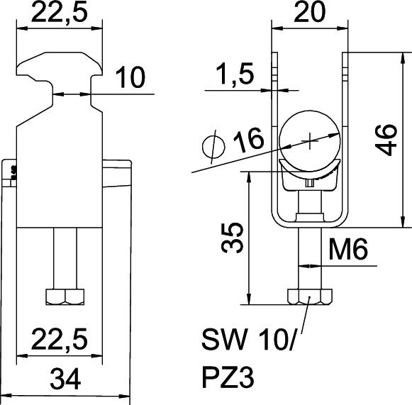 Clamping range D, max. 16 mm Clamping range D, min. 12 mm CO2 Footprint (GWP) Cradle-to-Gate 0,2045 kg CO2e / 1 Piece Dimension 12-16mm Dimension A 22,5 mm Dimension B 20 mm Dimension C 34 mm Dimension G (mm) M6 Dimension H 46 mm Dimension L 35 mm Dimension t 1,5 mm For pipe diameter, max. 16 mm For pipe diameter, min. 12 mm for rail with slot width (with interval), max. 17 mm for rail with slot width (with interval), min. 16 mm Halogen-free yes Height 46 mm Length 22,5 mm Length of external dimensions 34 mm Material Stainless steel 1.4301 Material addition Rustproof steel Material of trough Plastic Material quality of trough Polypropylene Max. Tightening torque 3 Nm Mounting type Profile rail Number of cables/pipes 1 Plate thickness 1,5 mm Slot width 10 mm Surface Bright, treated Surface addition Untreated Thread M6 Width 20 mm With counter-trough no With plastic trough yes - All types
