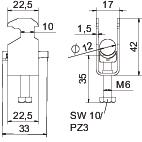 Product descriptionClamp clip with hammerhead foot, plastic pressure sleeve made of polypropylene. For vertical and horizontal mounting of 1 single cable on a C-profile rail. For a slot width 16–17 mm. With 1-start screw thread on pressure sleeve, universal hexagonal screw head WAF10, with slot and cross recess. Suitable for assembly indoors and outdoors. We recommend the use of a counter-sleeve.