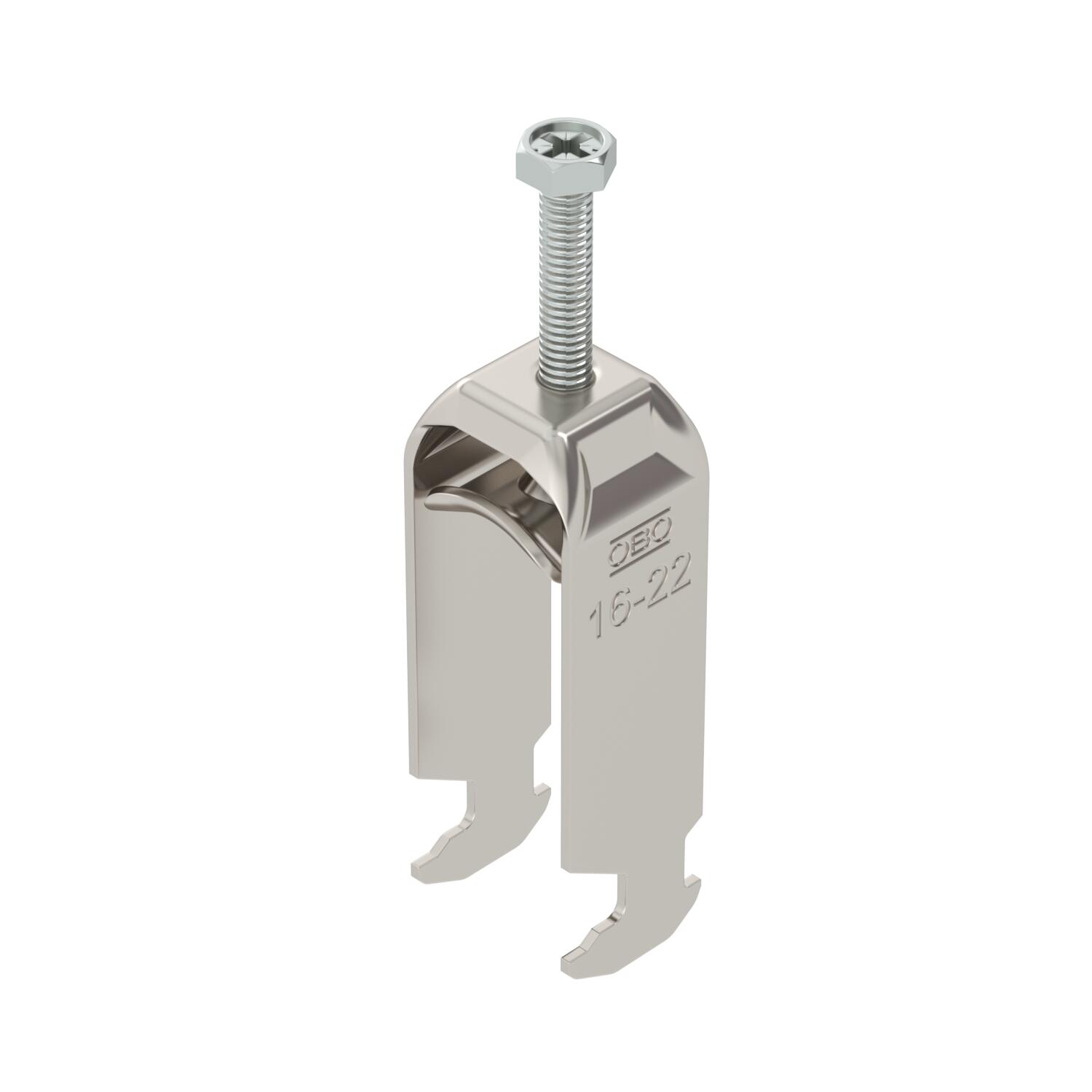 Product descriptionClamp clip with hammerhead foot, metal pressure sleeve with rounded edges to protect the cable. For vertical and horizontal mounting of 2 single cables on a C-profile rail. For a slot width 16–17 mm. With 1-start screw thread on pressure sleeve, universal hexagonal screw head WAF10, with slot and cross recess. Suitable for assembly indoors and outdoors. Multiple cables should be separated by double sleeves. We recommend the use of a counter-sleeve.