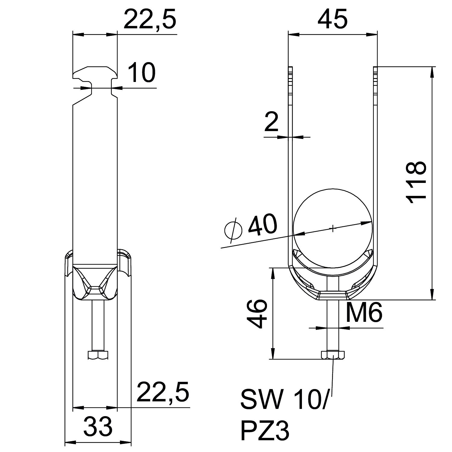 Clamping range D, max. 40 mm Clamping range D, min. 34 mm CO2 Footprint (GWP) Cradle-to-Gate 0,7835 kg CO2e / 1 Piece Dimension 34-40mm Dimension A 22,5 mm Dimension B 45 mm Dimension C 33 mm Dimension G (mm) M6 Dimension H 118 mm Dimension L 46 mm Dimension t 2 mm For pipe diameter, max. 40 mm For pipe diameter, min. 34 mm for rail with slot width (with interval), max. 17 mm for rail with slot width (with interval), min. 16 mm Halogen-free yes Height 118 mm Length 22,5 mm Length of external dimensions 33 mm Material Stainless steel 1.4301 Material addition Rustproof steel Material of trough Rustproof steel Material quality of trough Stainless steel 304 (1.4301) Max. Tightening torque 3 Nm Mounting type Profile rail Number of cables/pipes 2 Plate thickness 2 mm Slot width 10 mm Surface Bright, treated Surface addition Untreated Thread M6 Width 45 mm With counter-trough no With metal trough yes With plastic trough no - All types