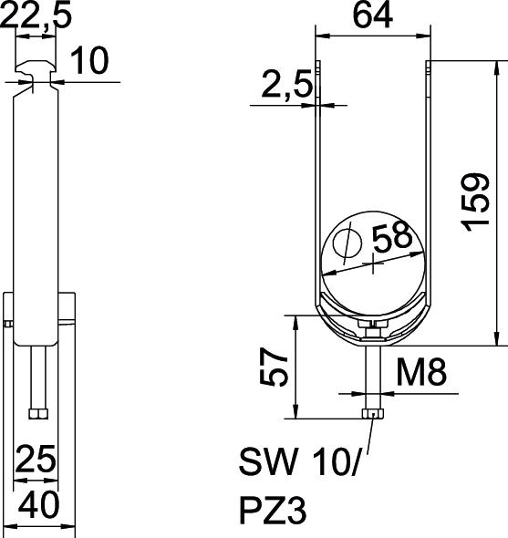 Clamping range D, max. 58 mm Clamping range D, min. 52 mm CO2 Footprint (GWP) Cradle-to-Gate 0,9019 kg CO2e / 1 Piece Dimension 52-58mm Dimension A 25 mm Dimension B 64 mm Dimension C 40 mm Dimension G (mm) M8 Dimension H 159 mm Dimension L 58 mm Dimension t 2,5 mm For pipe diameter, max. 58 mm For pipe diameter, min. 52 mm for rail with slot width (with interval), max. 17 mm for rail with slot width (with interval), min. 16 mm Halogen-free yes Height 159 mm Length 25 mm Length of external dimensions 40 mm Material Aluminium Material addition Aluminium Material of trough Plastic Material quality of trough Polypropylene Max. Tightening torque 2 Nm Mounting type Profile rail Number of cables/pipes 2 Plate thickness 2,5 mm Slot width 10 mm Surface addition Untreated Thread M8 Width 64 mm With counter-trough no With plastic trough yes - All types