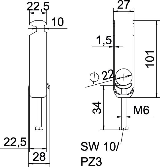 Clamping range D, max. 22 mm Clamping range D, min. 16 mm CO2 Footprint (GWP) Cradle-to-Gate 0,1759 kg CO2e / 1 Piece Dimension 16-22mm Dimension A 22,5 mm Dimension B 27 mm Dimension C 28 mm Dimension G (mm) M6 Dimension H 101 mm Dimension L 58 mm Dimension t 1,5 mm For pipe diameter, max. 22 mm For pipe diameter, min. 16 mm for rail with slot width (with interval), max. 17 mm for rail with slot width (with interval), min. 16 mm Halogen-free yes Height 101 mm Length 22,5 mm Length of external dimensions 28 mm Maintain electrical functions yes Material Steel Material addition Steel Material of trough Steel Max. Tightening torque 3 Nm Mounting type Profile rail Number of cables/pipes 3 Plate thickness 1,5 mm Slot width 10 mm Surface Hot-dip galvanised Surface addition hot galvanised Thread M6 Width 27 mm With counter-trough no With metal trough yes With plastic trough no - All types