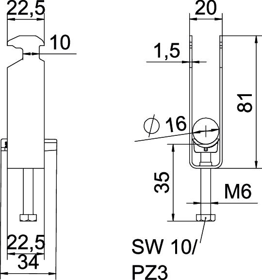 Clamping range D, max. 16 mm Clamping range D, min. 12 mm CO2 Footprint (GWP) Cradle-to-Gate 0,1355 kg CO2e / 1 Piece Dimension 12-16mm Dimension A 22,5 mm Dimension B 20 mm Dimension C 34 mm Dimension G (mm) M6 Dimension H 81 mm Dimension L 47 mm Dimension t 1,5 mm For pipe diameter, max. 16 mm For pipe diameter, min. 12 mm for rail with slot width (with interval), max. 17 mm for rail with slot width (with interval), min. 16 mm Halogen-free yes Height 81 mm Length 22,5 mm Length of external dimensions 34 mm Material Steel Material addition Steel Material of trough Plastic Material quality of trough Polypropylene Max. Tightening torque 3 Nm Mounting type Profile rail Number of cables/pipes 3 Plate thickness 1,5 mm Slot width 10 mm Surface Hot-dip galvanised Surface addition hot galvanised Thread M6 Width 20 mm With counter-trough no With plastic trough yes - All types