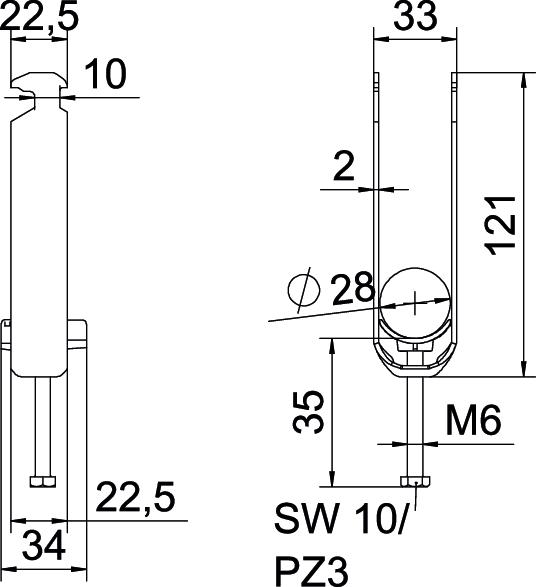 Clamping range D, max. 28 mm Clamping range D, min. 22 mm CO2 Footprint (GWP) Cradle-to-Gate 0,2307 kg CO2e / 1 Piece Dimension 22-28mm Dimension A 22,5 mm Dimension B 33 mm Dimension C 34 mm Dimension G (mm) M6 Dimension H 121 mm Dimension L 59 mm Dimension t 2 mm For pipe diameter, max. 28 mm For pipe diameter, min. 22 mm for rail with slot width (with interval), max. 17 mm for rail with slot width (with interval), min. 16 mm Halogen-free yes Height 121 mm Length 22,5 mm Length of external dimensions 34 mm Material Steel Material addition Steel Material of trough Plastic Material quality of trough Polypropylene Max. Tightening torque 3 Nm Mounting type Profile rail Number of cables/pipes 3 Plate thickness 2 mm Slot width 10 mm Surface Hot-dip galvanised Surface addition hot galvanised Thread M6 Width 33 mm With counter-trough no With plastic trough yes - All types