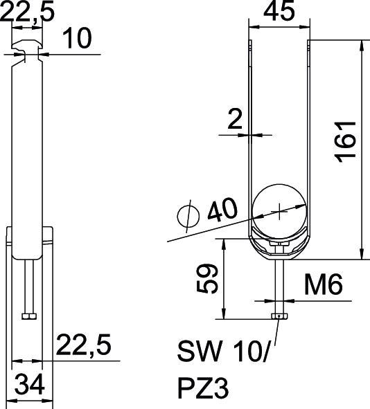Clamping range D, max. 40 mm Clamping range D, min. 34 mm CO2 Footprint (GWP) Cradle-to-Gate 0,422 kg CO2e / 1 Piece Dimension 34-40mm Dimension A 22,5 mm Dimension B 45 mm Dimension C 34 mm Dimension G (mm) M6 Dimension H 161 mm Dimension L 59 mm Dimension t 2 mm For pipe diameter, max. 40 mm For pipe diameter, min. 34 mm for rail with slot width (with interval), max. 17 mm for rail with slot width (with interval), min. 16 mm Halogen-free yes Height 161 mm Length 22,5 mm Length of external dimensions 34 mm Material Steel Material addition Steel Material of trough Plastic Material quality of trough Polypropylene Max. Tightening torque 3 Nm Mounting type Profile rail Number of cables/pipes 3 Plate thickness 2 mm Slot width 10 mm Surface Hot-dip galvanised Surface addition hot galvanised Thread M6 Width 45 mm With counter-trough no With plastic trough yes - All types
