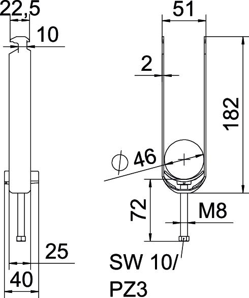Clamping range D, max. 46 mm Clamping range D, min. 40 mm CO2 Footprint (GWP) Cradle-to-Gate 0,4848 kg CO2e / 1 Piece Dimension 40-46mm Dimension A 25 mm Dimension B 51 mm Dimension C 40 mm Dimension G (mm) M8 Dimension H 182 mm Dimension L 72 mm Dimension t 2 mm For pipe diameter, max. 46 mm For pipe diameter, min. 40 mm for rail with slot width (with interval), max. 17 mm for rail with slot width (with interval), min. 16 mm Halogen-free yes Height 182 mm Length 25 mm Length of external dimensions 40 mm Material Steel Material addition Steel Material of trough Plastic Material quality of trough Polypropylene Max. Tightening torque 5 Nm Mounting type Profile rail Number of cables/pipes 3 Plate thickness 2 mm Slot width 10 mm Surface Hot-dip galvanised Surface addition hot galvanised Thread M8 Width 51 mm With counter-trough no With plastic trough yes - All types