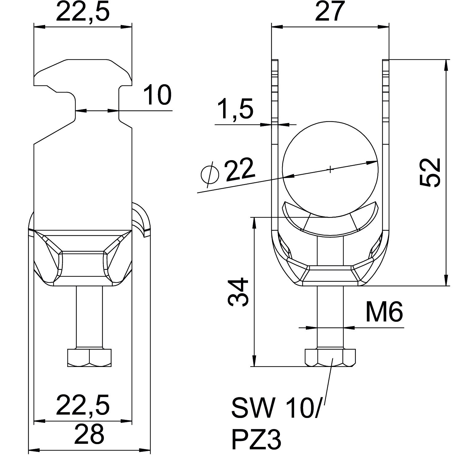 Clamping range D, max. 22 mm Clamping range D, min. 16 mm CO2 Footprint (GWP) Cradle-to-Gate 0,297 kg CO2e / 1 Piece Dimension 16-22mm Dimension A 22,5 mm Dimension B 27 mm Dimension C 28 mm Dimension G (mm) M6 Dimension H 52 mm Dimension L 34 mm Dimension t 1,5 mm For pipe diameter, max. 22 mm For pipe diameter, min. 16 mm for rail with slot width (with interval), max. 17 mm for rail with slot width (with interval), min. 16 mm Halogen-free yes Height 52 mm Length 22,5 mm Length of external dimensions 28 mm Maintain electrical functions yes Material Stainless steel 1.4571 Material addition Rustproof steel Max. Tightening torque 3 Nm Mounting type Profile rail Number of cables/pipes 1 Plate thickness 1,5 mm Slot width 10 mm Surface Bright, treated Surface addition Untreated Thread M6 Width 27 mm With metal trough yes - All types