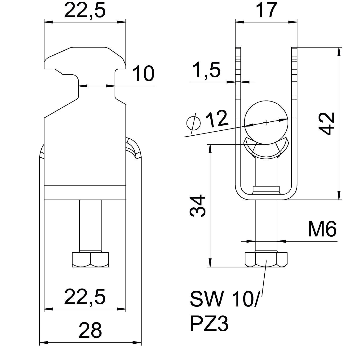 Clamping range D, max. 12 mm Clamping range D, min. 8 mm CO2 Footprint (GWP) Cradle-to-Gate 0,2436 kg CO2e / 1 Piece Dimension 8-12mm Dimension A 22,5 mm Dimension B 17 mm Dimension C 28 mm Dimension G (mm) M6 Dimension H 42 mm Dimension L 34 mm Dimension t 1,5 mm For pipe diameter, max. 12 mm For pipe diameter, min. 8 mm for rail with slot width (with interval), max. 17 mm for rail with slot width (with interval), min. 16 mm Halogen-free yes Height 42 mm Length 22,5 mm Length of external dimensions 28 mm Maintain electrical functions yes Material Stainless steel 1.4571 Material addition Rustproof steel Max. Tightening torque 3 Nm Mounting type Profile rail Number of cables/pipes 1 Plate thickness 1,5 mm Slot width 10 mm Surface Bright, treated Surface addition Untreated Thread M6 Width 17 mm With metal trough yes - All types