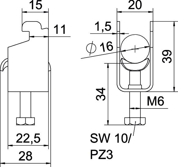 Clamping range D, max. 16 mm Clamping range D, min. 12 mm CO2 Footprint (GWP) Cradle-to-Gate 0,0797 kg CO2e / 1 Piece Dimension 12-16mm Dimension A 22,5 mm Dimension B 20 mm Dimension C 28 mm Dimension G (mm) M6 Dimension H 39 mm Dimension L 34 mm Dimension t 1,5 mm For pipe diameter, max. 16 mm For pipe diameter, min. 12 mm for rail with slot width (with interval), max. 12 mm for rail with slot width (with interval), min. 11 mm Halogen-free yes Height 39 mm Length 22,5 mm Length of external dimensions 28 mm Material Steel Material addition Steel Material of trough Steel Max. Tightening torque 3 Nm Mounting type Profile rail Number of cables/pipes 1 Plate thickness 1,5 mm Slot width 10 mm Surface Hot-dip galvanised Surface addition hot galvanised Thread M6 Width 20 mm With counter-trough no With metal trough yes - All types