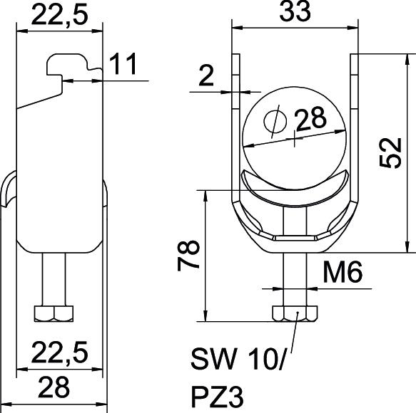 Clamping range D, max. 28 mm Clamping range D, min. 22 mm CO2 Footprint (GWP) Cradle-to-Gate 0,1425 kg CO2e / 1 Piece Dimension 22-28mm Dimension A 22,5 mm Dimension B 33 mm Dimension C 28 mm Dimension G (mm) M6 Dimension H 52 mm Dimension L 34 mm Dimension t 2 mm For pipe diameter, max. 28 mm For pipe diameter, min. 22 mm for rail with slot width (with interval), max. 12 mm for rail with slot width (with interval), min. 11 mm Halogen-free yes Height 52 mm Length 22,5 mm Length of external dimensions 28 mm Material Steel Material addition Steel Material of trough Steel Max. Tightening torque 3 Nm Mounting type Profile rail Number of cables/pipes 1 Plate thickness 2 mm Slot width 10 mm Surface Hot-dip galvanised Surface addition hot galvanised Thread M6 Width 33 mm With counter-trough no With metal trough yes - All types