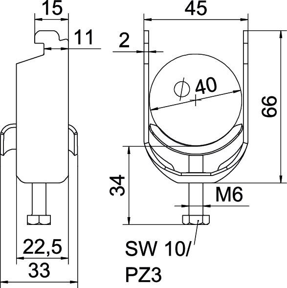 Clamping range D, max. 40 mm Clamping range D, min. 34 mm CO2 Footprint (GWP) Cradle-to-Gate 0,1714 kg CO2e / 1 Piece Dimension 34-40mm Dimension A 22,5 mm Dimension B 45 mm Dimension C 33 mm Dimension G (mm) M6 Dimension H 66 mm Dimension L 34 mm Dimension t 2 mm For pipe diameter, max. 40 mm For pipe diameter, min. 34 mm for rail with slot width (with interval), max. 12 mm for rail with slot width (with interval), min. 11 mm Halogen-free yes Height 66 mm Length 22,5 mm Length of external dimensions 33 mm Material Steel Material addition Steel Material of trough Steel Max. Tightening torque 3 Nm Mounting type Profile rail Number of cables/pipes 1 Plate thickness 2 mm Slot width 10 mm Surface Hot-dip galvanised Surface addition hot galvanised Thread M6 Width 45 mm With counter-trough no With metal trough yes - All types