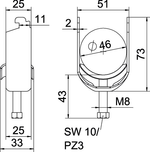Clamping range D, max. 46 mm Clamping range D, min. 40 mm CO2 Footprint (GWP) Cradle-to-Gate 0,236 kg CO2e / 1 Piece Dimension 40-46mm Dimension A 25 mm Dimension B 51 mm Dimension C 33 mm Dimension G (mm) M8 Dimension H 73 mm Dimension L 43 mm Dimension t 2 mm For pipe diameter, max. 46 mm For pipe diameter, min. 40 mm for rail with slot width (with interval), max. 12 mm for rail with slot width (with interval), min. 11 mm Halogen-free yes Height 73 mm Length 25 mm Length of external dimensions 33 mm Material Steel Material addition Steel Material of trough Steel Max. Tightening torque 5 Nm Mounting type Profile rail Number of cables/pipes 1 Plate thickness 2 mm Slot width 10 mm Surface Hot-dip galvanised Surface addition hot galvanised Thread M8 Width 51 mm With counter-trough no With metal trough yes - All types