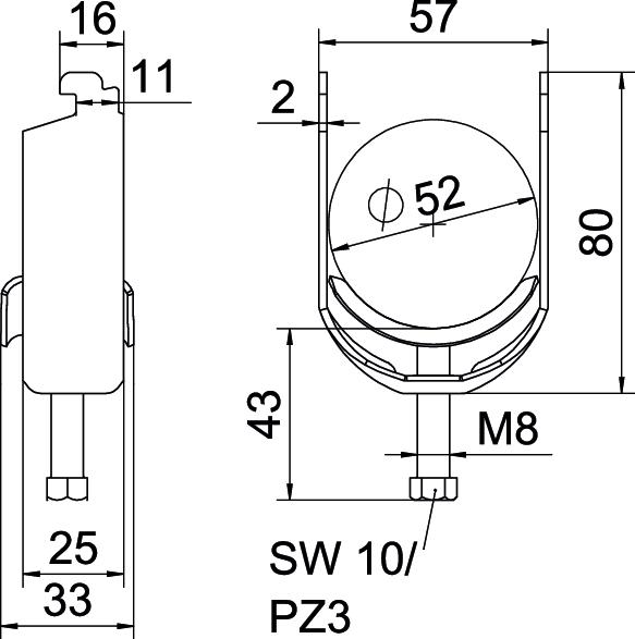 Clamping range D, max. 52 mm Clamping range D, min. 46 mm CO2 Footprint (GWP) Cradle-to-Gate 0,2582 kg CO2e / 1 Piece Dimension 46-52mm Dimension A 25 mm Dimension B 57 mm Dimension C 33 mm Dimension G (mm) M8 Dimension H 80 mm Dimension L 43 mm Dimension t 2 mm For pipe diameter, max. 52 mm For pipe diameter, min. 46 mm for rail with slot width (with interval), max. 12 mm for rail with slot width (with interval), min. 11 mm Halogen-free yes Height 80 mm Length 25 mm Length of external dimensions 33 mm Material Steel Material addition Steel Material of trough Steel Max. Tightening torque 5 Nm Mounting type Profile rail Number of cables/pipes 1 Plate thickness 2 mm Slot width 10 mm Surface Hot-dip galvanised Surface addition hot galvanised Thread M8 Width 57 mm With counter-trough no With metal trough yes - All types