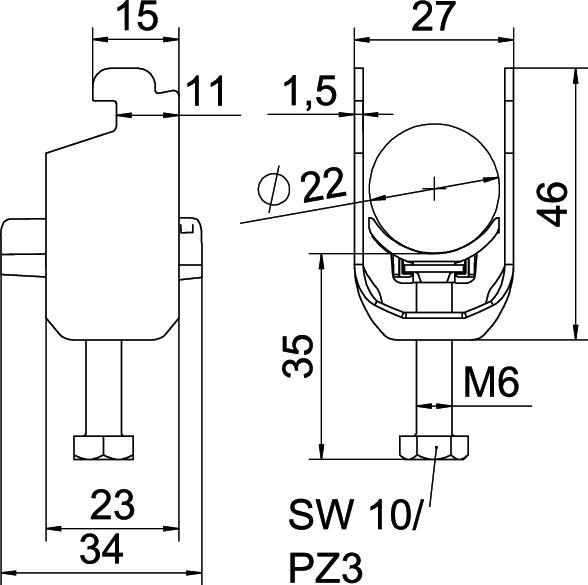 Clamping range D, max. 22 mm Clamping range D, min. 16 mm CO2 Footprint (GWP) Cradle-to-Gate 0,242 kg CO2e / 1 Piece Dimension 16-22mm Dimension A 22,5 mm Dimension B 27 mm Dimension C 34 mm Dimension G (mm) M6 Dimension H 46 mm Dimension L 35 mm Dimension t 1,5 mm for rail with slot width (with interval), max. 12 mm for rail with slot width (with interval), min. 11 mm Halogen-free yes Height 46 mm Length 22,5 mm Length of external dimensions 34 mm Material Stainless steel 1.4301 Material addition Rustproof steel Material of trough Plastic Material quality of trough Polypropylene Max. Tightening torque 3 Nm Mounting type Profile rail Number of cables/pipes 1 Plate thickness 1,5 mm Slot width 10 mm Surface Bright, treated Surface addition Untreated Thread M6 Width 27 mm With counter-trough no With plastic trough yes - All types