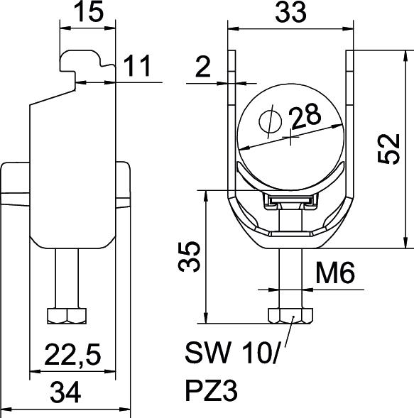 Clamping range D, max. 28 mm Clamping range D, min. 22 mm CO2 Footprint (GWP) Cradle-to-Gate 0,2542 kg CO2e / 1 Piece Dimension 22-28mm Dimension A 22,5 mm Dimension B 33 mm Dimension C 34 mm Dimension G (mm) M6 Dimension H 52 mm Dimension L 35 mm Dimension t 2 mm For pipe diameter, max. 28 mm For pipe diameter, min. 22 mm for rail with slot width (with interval), max. 12 mm for rail with slot width (with interval), min. 11 mm Halogen-free yes Height 52 mm Length 22,5 mm Length of external dimensions 34 mm Material Aluminium Material addition Aluminium Material of trough Plastic Material quality of trough Polypropylene Max. Tightening torque 2 Nm Mounting type Profile rail Number of cables/pipes 1 Plate thickness 2 mm Slot width 10 mm Surface addition Untreated Thread M6 Width 33 mm With counter-trough no With plastic trough yes - All types
