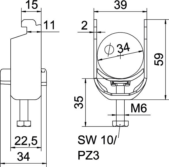 Clamping range D, max. 34 mm Clamping range D, min. 28 mm CO2 Footprint (GWP) Cradle-to-Gate 0,2775 kg CO2e / 1 Piece Dimension 28-34mm Dimension A 22,5 mm Dimension B 39 mm Dimension C 34 mm Dimension G (mm) M6 Dimension H 59 mm Dimension L 35 mm Dimension t 2 mm For pipe diameter, max. 34 mm For pipe diameter, min. 28 mm for rail with slot width (with interval), max. 12 mm for rail with slot width (with interval), min. 11 mm Halogen-free yes Height 59 mm Length 22,5 mm Length of external dimensions 34 mm Material Aluminium Material addition Aluminium Material of trough Plastic Material quality of trough Polypropylene Max. Tightening torque 2 Nm Mounting type Profile rail Number of cables/pipes 1 Plate thickness 2 mm Slot width 10 mm Surface addition Untreated Thread M6 Width 39 mm With counter-trough no With plastic trough yes - All types