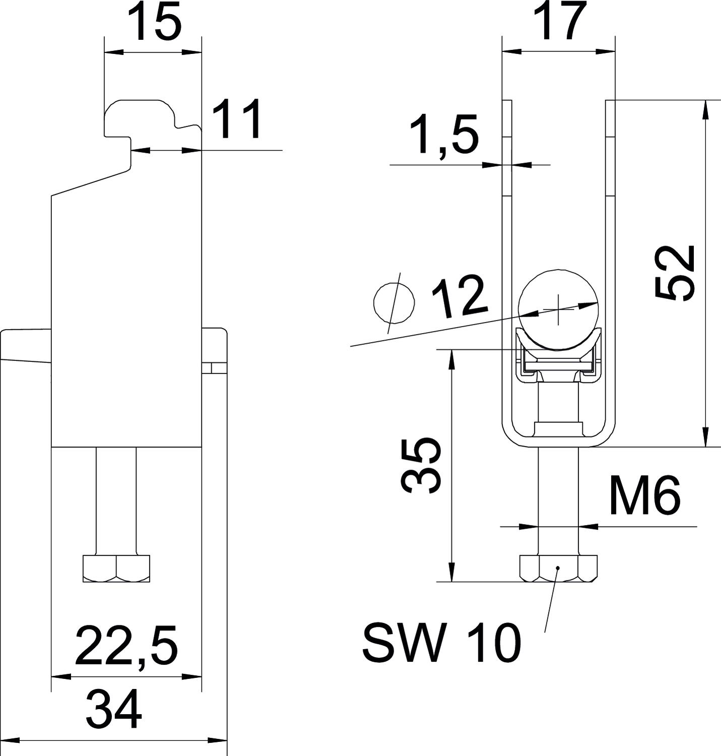 Clamping range D, max. 12 mm Clamping range D, min. 8 mm CO2 Footprint (GWP) Cradle-to-Gate 0,1329 kg CO2e / 1 Piece Dimension 08-12mm Dimension A 22,5 mm Dimension B 17 mm Dimension C 34 mm Dimension G (mm) M6 Dimension H 52 mm Dimension L 47 mm Dimension t 1,5 mm For pipe diameter, max. 12 mm For pipe diameter, min. 8 mm for rail with slot width (with interval), max. 12 mm for rail with slot width (with interval), min. 11 mm Halogen-free yes Height 52 mm Length 22,5 mm Length of external dimensions 34 mm Material Steel Material addition Steel Material of trough Plastic Material quality of trough Polypropylene Max. Tightening torque 3 Nm Mounting type Profile rail Number of cables/pipes 2 Plate thickness 1,5 mm Slot width 10 mm Surface Hot-dip galvanised Surface addition hot galvanised Thread M6 Width 17 mm With counter-trough no With plastic trough yes - All types