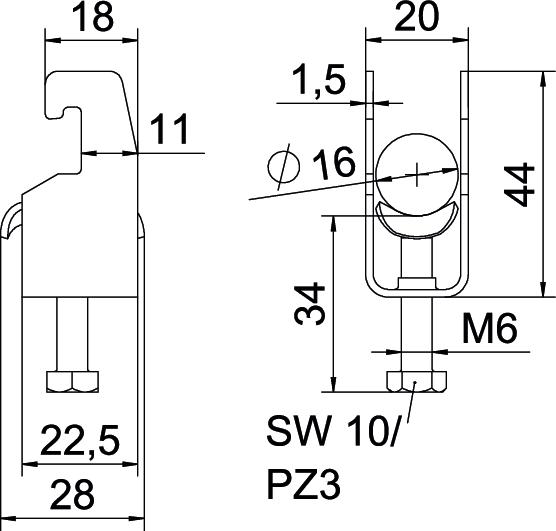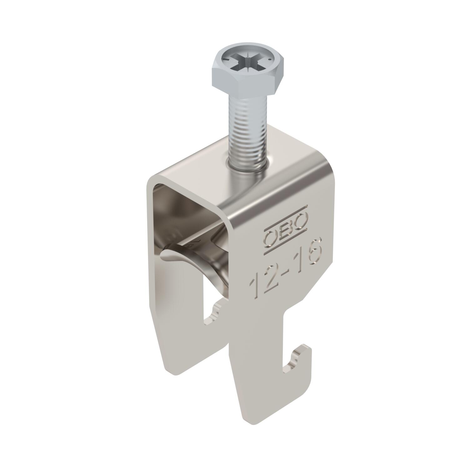 Product descriptionClamp clip with U-foot, metal pressure sleeve with rounded edges to protect the cable. For vertical and horizontal mounting of 1 single cable on a C-profile rail. For slot width 18–22 mm. With 1-start screw thread on pressure sleeve, universal hexagonal screw head WAF10, with slot and cross recess. Suitable for assembly indoors and outdoors. We recommend the use of a counter-sleeve.