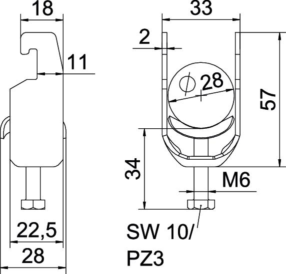 Product descriptionClamp clip with U-foot, metal pressure sleeve with rounded edges to protect the cable. For vertical and horizontal mounting of 1 single cable on a C-profile rail. For slot width 18–22 mm. With 1-start screw thread on pressure sleeve, universal hexagonal screw head WAF10, with slot and cross recess. Suitable for assembly indoors and outdoors. We recommend the use of a counter-sleeve.