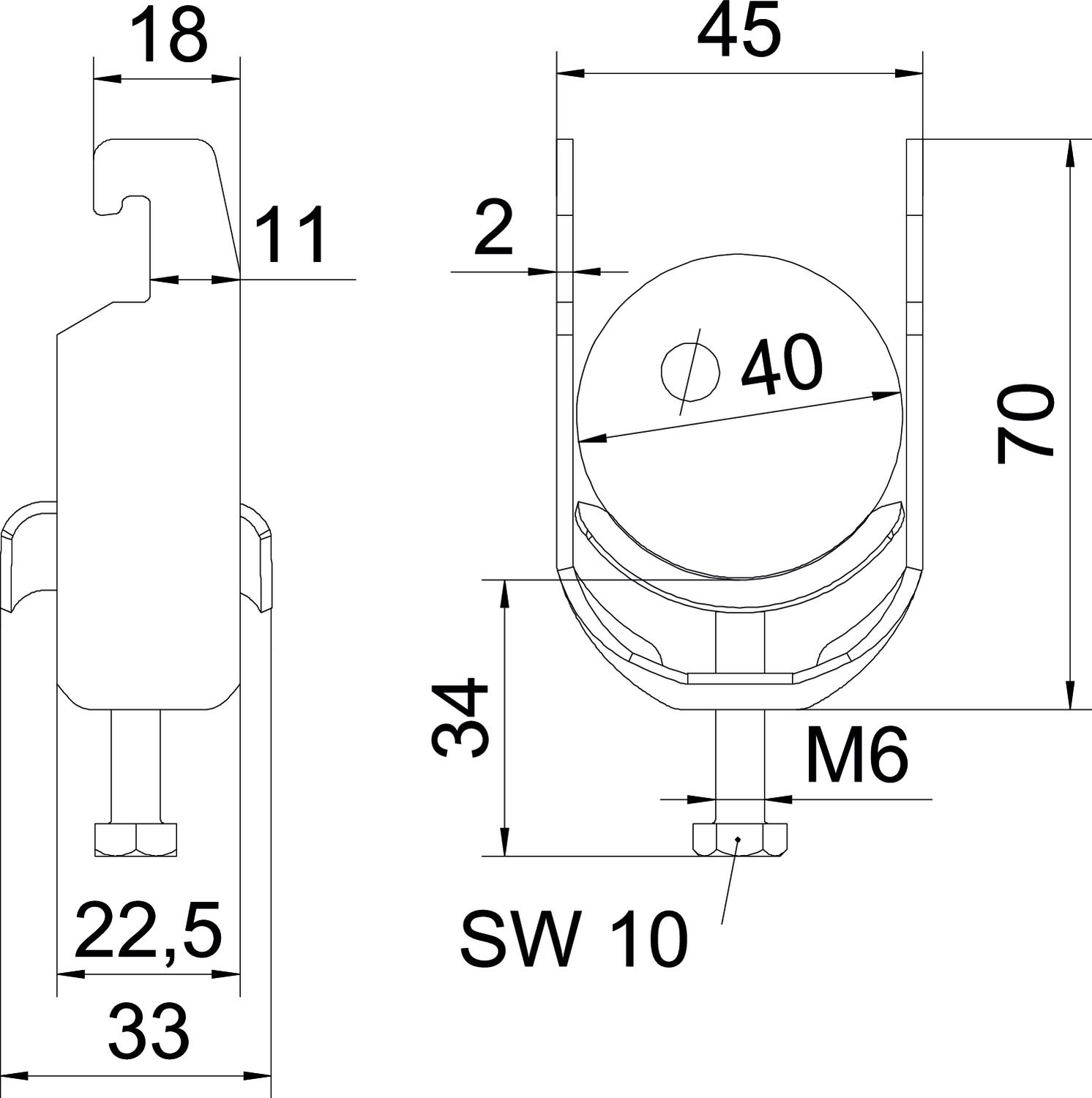 Clamping range D, max. 40 mm Clamping range D, min. 34 mm CO2 Footprint (GWP) Cradle-to-Gate 0,4007 kg CO2e / 1 Piece Dimension 34-40mm Dimension A 22,5 mm Dimension B 45 mm Dimension C 33 mm Dimension G (mm) M6 Dimension H 70 mm Dimension L 34 mm Dimension t 2 mm For pipe diameter, max. 40 mm For pipe diameter, min. 34 mm for rail with slot width (with interval), max. 22 mm for rail with slot width (with interval), min. 18 mm Halogen-free yes Height 70 mm Length 22,5 mm Length of external dimensions 33 mm Material Stainless steel 1.4571 Material addition Rustproof steel Material of trough Rustproof steel Max. Tightening torque 3 Nm Mounting type Profile rail Number of cables/pipes 1 Plate thickness 2 mm Slot width 10 mm Surface Bright, treated Surface addition Untreated Thread M6 Width 45 mm With counter-trough no With metal trough yes - All types