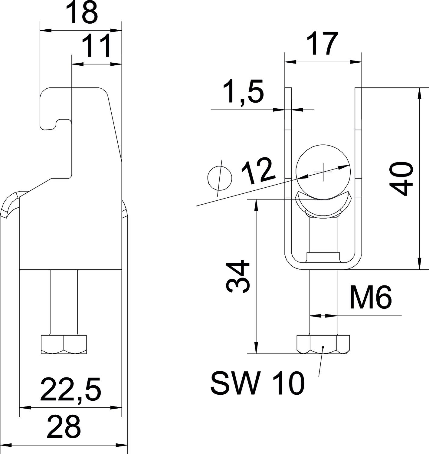 Clamping range D, max. 12 mm Clamping range D, min. 8 mm CO2 Footprint (GWP) Cradle-to-Gate 0,2279 kg CO2e / 1 Piece Dimension 08-12mm Dimension A 22,5 mm Dimension B 17 mm Dimension C 28 mm Dimension G (mm) M6 Dimension H 40 mm Dimension L 34 mm Dimension t 1,5 mm For pipe diameter, max. 12 mm For pipe diameter, min. 8 mm for rail with slot width (with interval), max. 22 mm for rail with slot width (with interval), min. 18 mm Halogen-free yes Height 40 mm Length 22,5 mm Length of external dimensions 28 mm Material Stainless steel 1.4571 Material addition Rustproof steel Material of trough Rustproof steel Max. Tightening torque 3 Nm Mounting type Profile rail Number of cables/pipes 1 Plate thickness 1,5 mm Slot width 10 mm Surface Bright, treated Surface addition Untreated Thread M6 Width 17 mm With counter-trough no With metal trough yes - All types