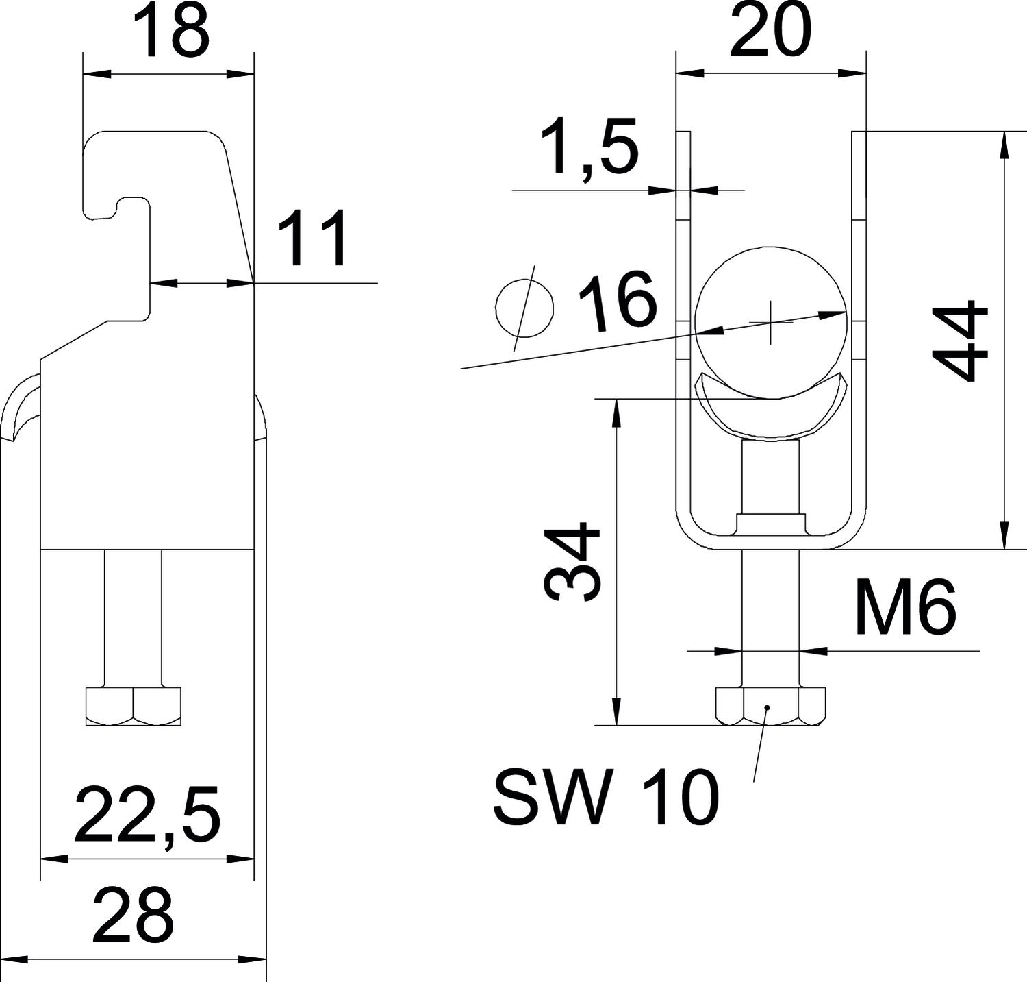 Clamping range D, max. 16 mm Clamping range D, min. 12 mm CO2 Footprint (GWP) Cradle-to-Gate 0,0897 kg CO2e / 1 Piece Dimension 12-16mm Dimension A 22,5 mm Dimension B 20 mm Dimension C 28 mm Dimension G (mm) M6 Dimension H 44 mm Dimension L 34 mm Dimension t 1,5 mm For pipe diameter, max. 16 mm For pipe diameter, min. 12 mm for rail with slot width (with interval), max. 22 mm for rail with slot width (with interval), min. 18 mm Halogen-free yes Height 44 mm Length 22,5 mm Length of external dimensions 28 mm Maintain electrical functions yes Material Steel Material addition Steel Material of trough Steel Max. Tightening torque 3 Nm Mounting type Profile rail Number of cables/pipes 1 Plate thickness 1,5 mm Slot width 10 mm Surface Hot-dip galvanised Surface addition hot galvanised Thread M6 Width 20 mm With counter-trough no With metal trough yes - All types