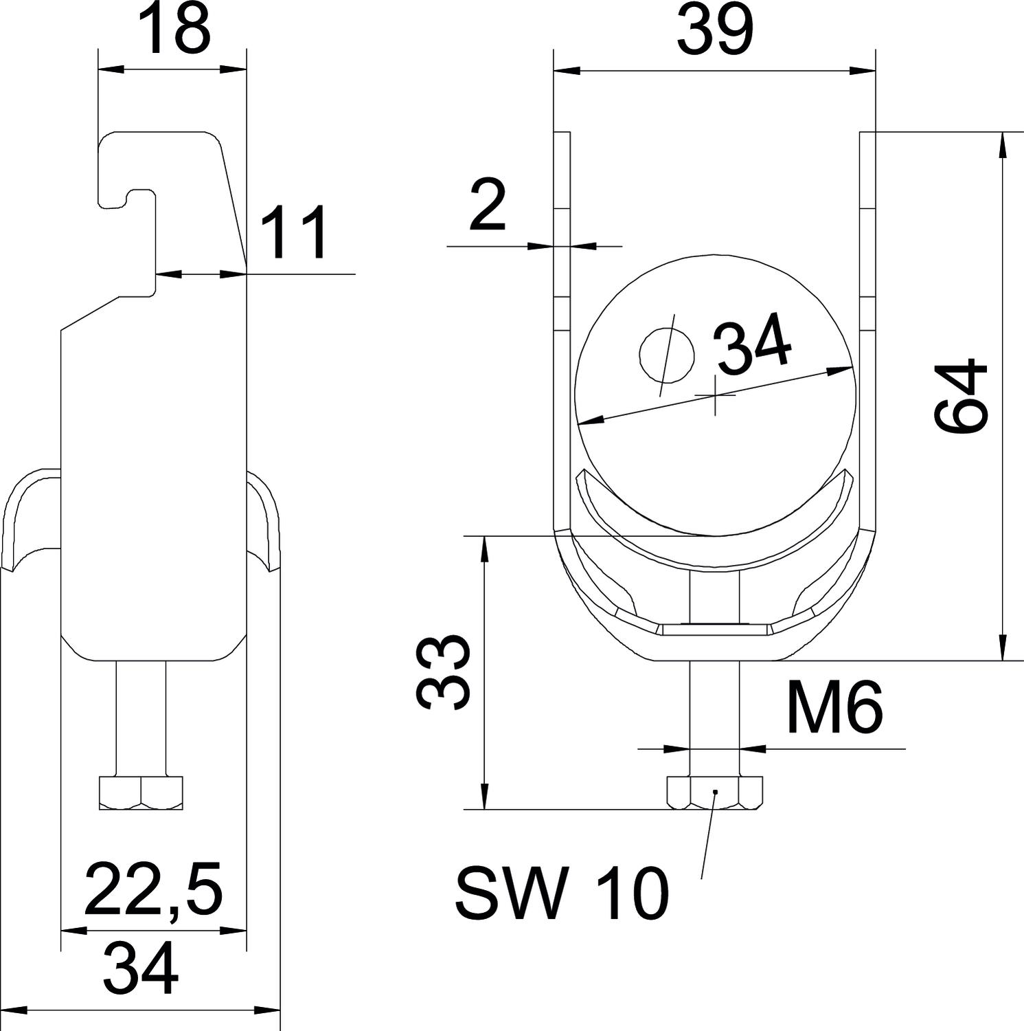 Clamping range D, max. 34 mm Clamping range D, min. 28 mm CO2 Footprint (GWP) Cradle-to-Gate 0,1597 kg CO2e / 1 Piece Dimension 28-34mm Dimension A 22,5 mm Dimension B 39 mm Dimension C 34 mm Dimension G (mm) M6 Dimension H 64 mm Dimension L 34 mm Dimension t 2 mm For pipe diameter, max. 34 mm For pipe diameter, min. 28 mm for rail with slot width (with interval), max. 22 mm for rail with slot width (with interval), min. 18 mm Halogen-free yes Height 64 mm Length 22,5 mm Length of external dimensions 34 mm Maintain electrical functions yes Material Steel Material addition Steel Material of trough Steel Max. Tightening torque 3 Nm Mounting type Profile rail Number of cables/pipes 1 Plate thickness 2 mm Slot width 10 mm Surface Hot-dip galvanised Surface addition hot galvanised Thread M6 Width 39 mm With counter-trough no With metal trough yes - All types