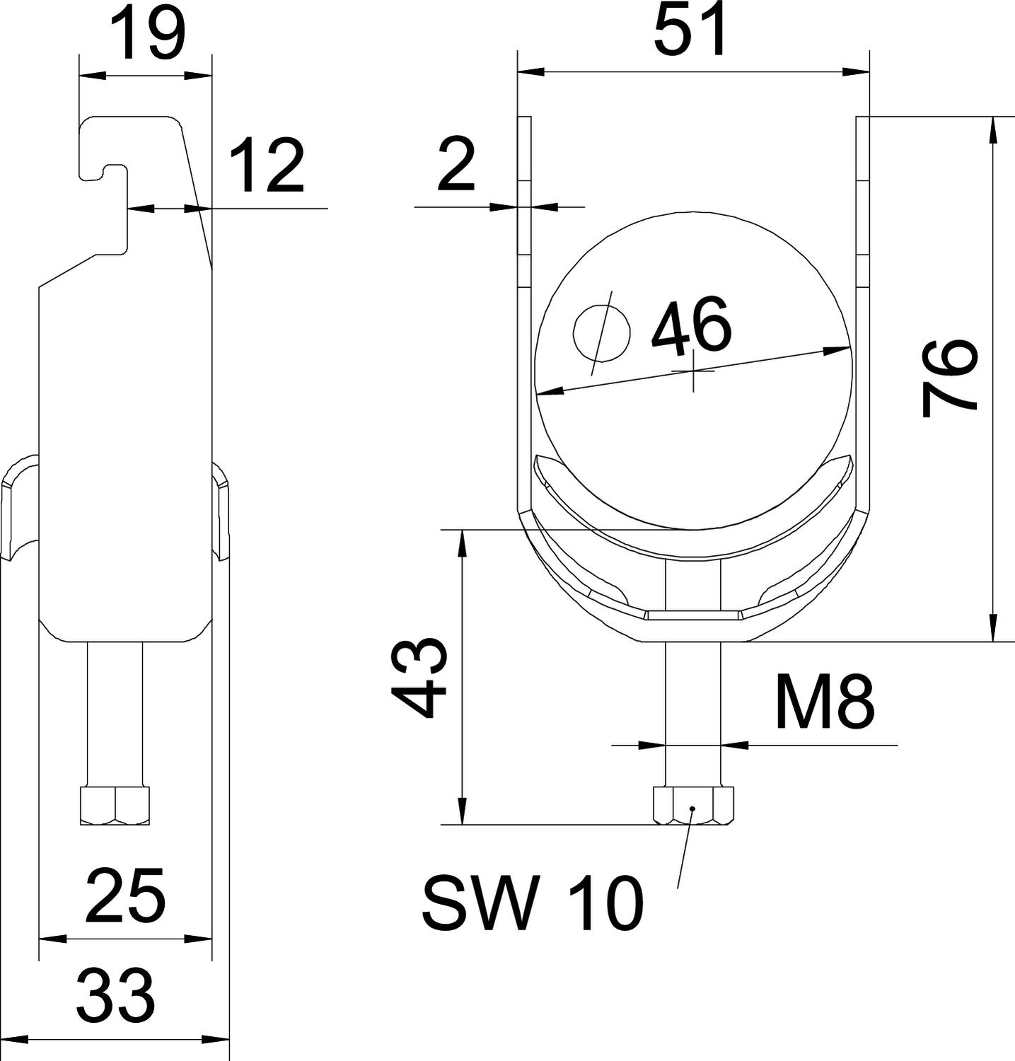 Clamping range D, max. 46 mm Clamping range D, min. 40 mm CO2 Footprint (GWP) Cradle-to-Gate 0,2404 kg CO2e / 1 Piece Dimension 40-46mm Dimension A 25 mm Dimension B 51 mm Dimension C 33 mm Dimension G (mm) M8 Dimension H 76 mm Dimension L 43 mm Dimension t 2 mm For pipe diameter, max. 46 mm For pipe diameter, min. 40 mm for rail with slot width (with interval), max. 22 mm for rail with slot width (with interval), min. 18 mm Halogen-free yes Height 76 mm Length 25 mm Length of external dimensions 33 mm Maintain electrical functions yes Material Steel Material addition Steel Material of trough Steel Max. Tightening torque 5 Nm Mounting type Profile rail Number of cables/pipes 1 Plate thickness 2 mm Slot width 10 mm Surface Hot-dip galvanised Surface addition hot galvanised Thread M8 Width 51 mm With counter-trough no With metal trough yes - All types