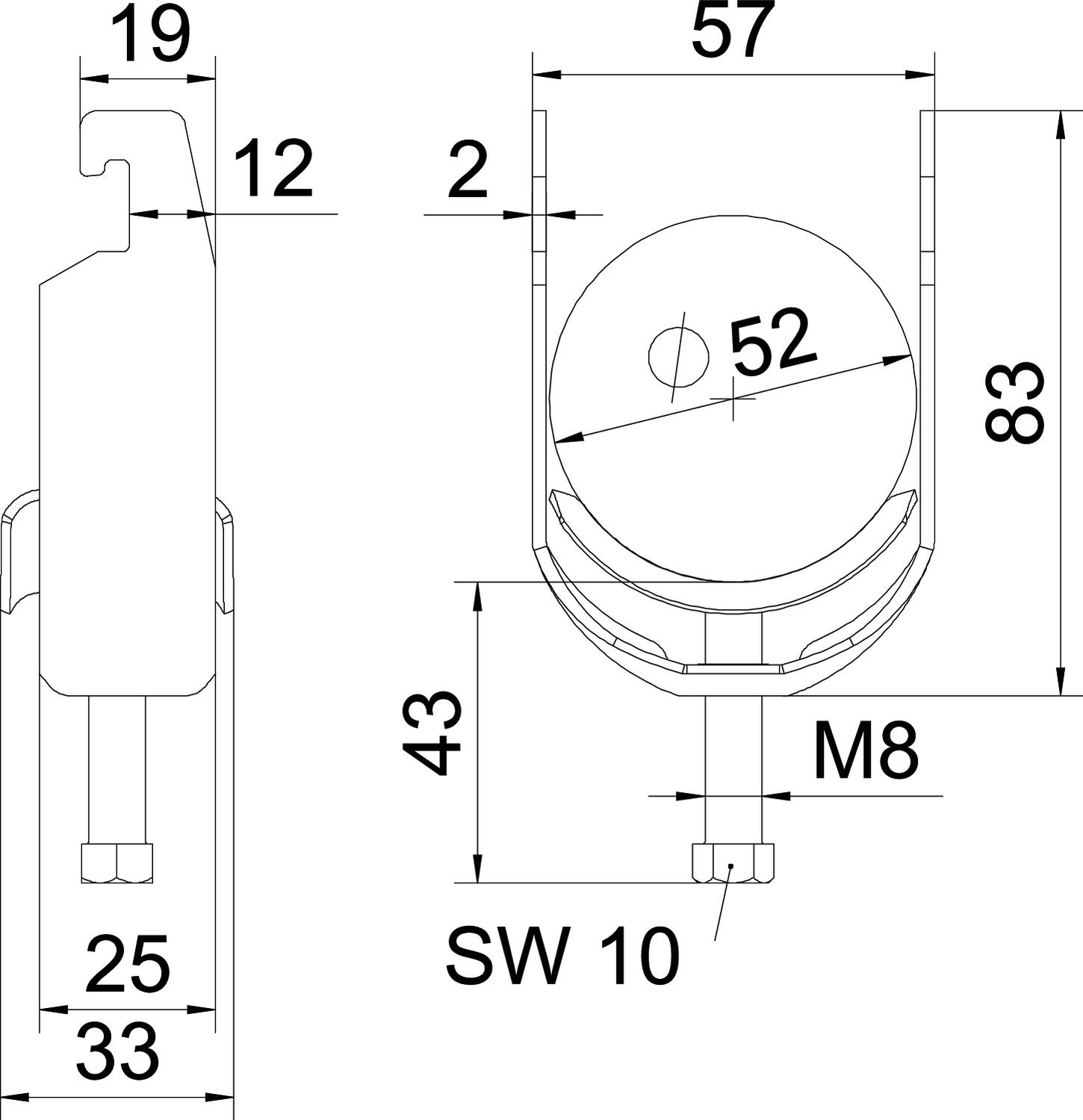 Clamping range D, max. 52 mm Clamping range D, min. 46 mm CO2 Footprint (GWP) Cradle-to-Gate 0,2624 kg CO2e / 1 Piece Dimension 46-52mm Dimension A 25 mm Dimension B 57 mm Dimension C 33 mm Dimension G (mm) M8 Dimension H 83 mm Dimension L 43 mm Dimension t 2 mm For pipe diameter, max. 52 mm For pipe diameter, min. 46 mm for rail with slot width (with interval), max. 22 mm for rail with slot width (with interval), min. 18 mm Halogen-free yes Height 83 mm Length 25 mm Length of external dimensions 33 mm Maintain electrical functions yes Material Steel Material addition Steel Material of trough Steel Max. Tightening torque 5 Nm Mounting type Profile rail Number of cables/pipes 1 Plate thickness 2 mm Slot width 10 mm Surface Hot-dip galvanised Surface addition hot galvanised Thread M8 Width 57 mm With counter-trough no With metal trough yes - All types
