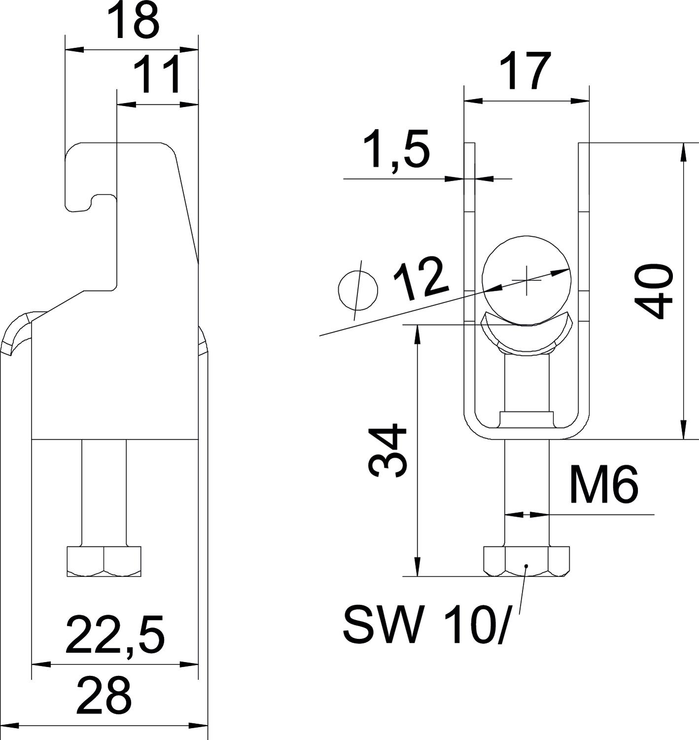 Clamping range D, max. 12 mm Clamping range D, min. 8 mm CO2 Footprint (GWP) Cradle-to-Gate 0,0852 kg CO2e / 1 Piece Dimension 08-12mm Dimension A 22,5 mm Dimension B 17 mm Dimension C 28 mm Dimension G (mm) M6 Dimension H 40 mm Dimension L 34 mm Dimension t 1,5 mm For pipe diameter, max. 12 mm For pipe diameter, min. 8 mm for rail with slot width (with interval), max. 22 mm for rail with slot width (with interval), min. 18 mm Halogen-free yes Height 40 mm Length 22,5 mm Length of external dimensions 28 mm Maintain electrical functions yes Material Steel Material addition Steel Material of trough Steel Max. Tightening torque 3 Nm Mounting type Profile rail Number of cables/pipes 1 Plate thickness 1,5 mm Slot width 10 mm Surface Hot-dip galvanised Surface addition hot galvanised Thread M6 Width 17 mm With counter-trough no With metal trough yes - All types